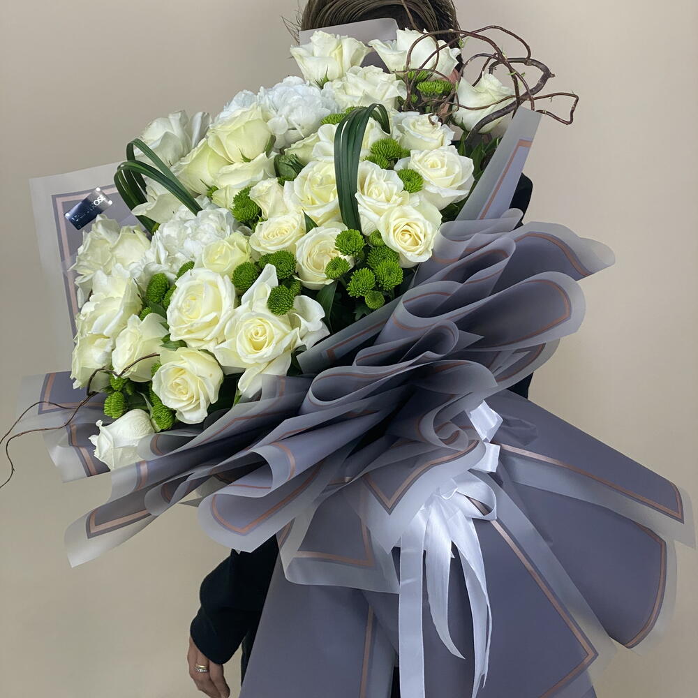 hydrangeas white - 2 pcs chrysanthemum green - 5 pcs athena white roses - 31 pcs