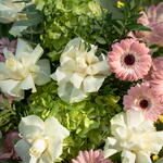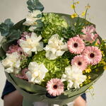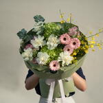 Eucalyptus - 1 pcs White rose - 6 pcs hydrangea green - 2 pcs germini pink - 4 pcs alstroemeria pink - 4 pcs oncidium yellow - 3 pcs
