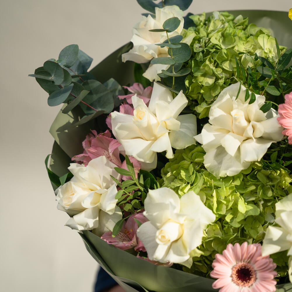 Eucalyptus - 1 pcs White rose - 6 pcs hydrangea green - 2 pcs germini pink - 4 pcs alstroemeria pink - 4 pcs oncidium yellow - 3 pcs