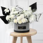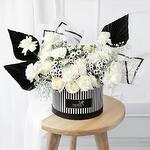 gypso - 3 pcs roses - 14 pcs spray chresynthamum - 1 pcs saintiny - 3 pcs table palm dried - 3 pcs
