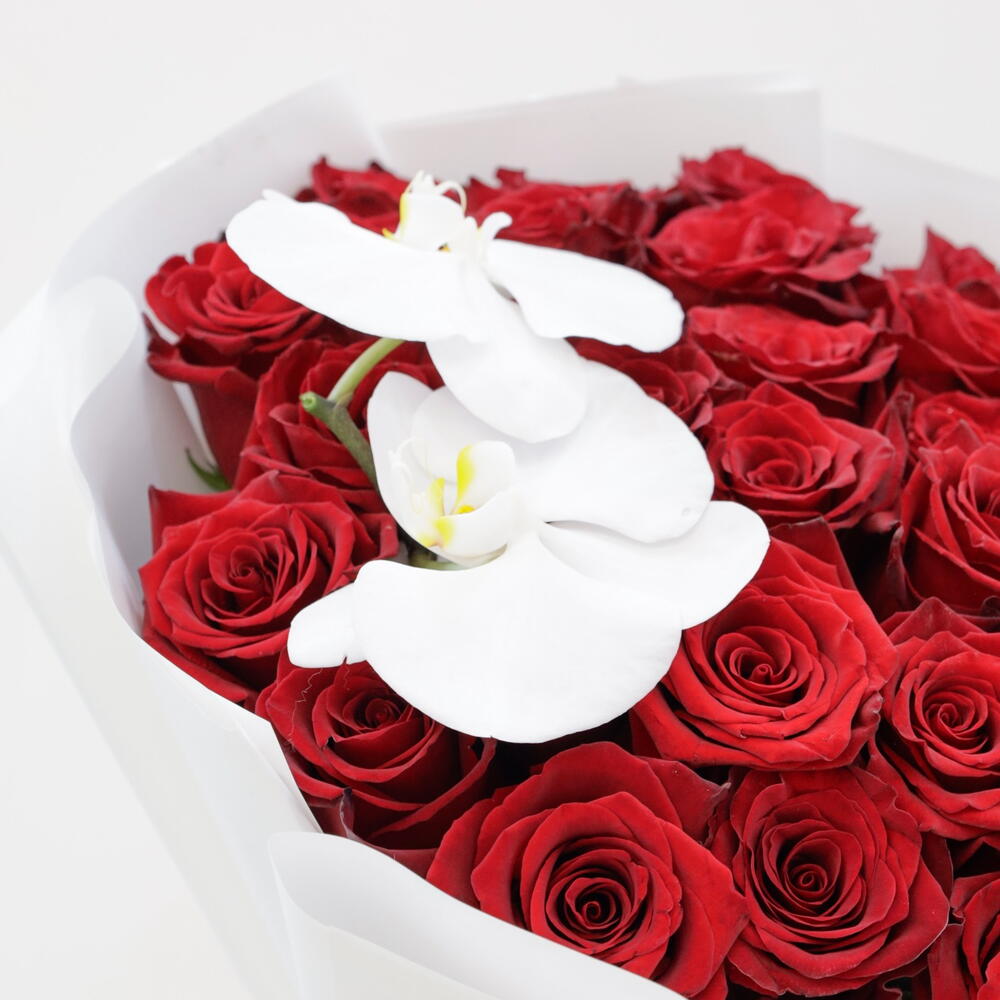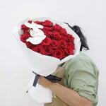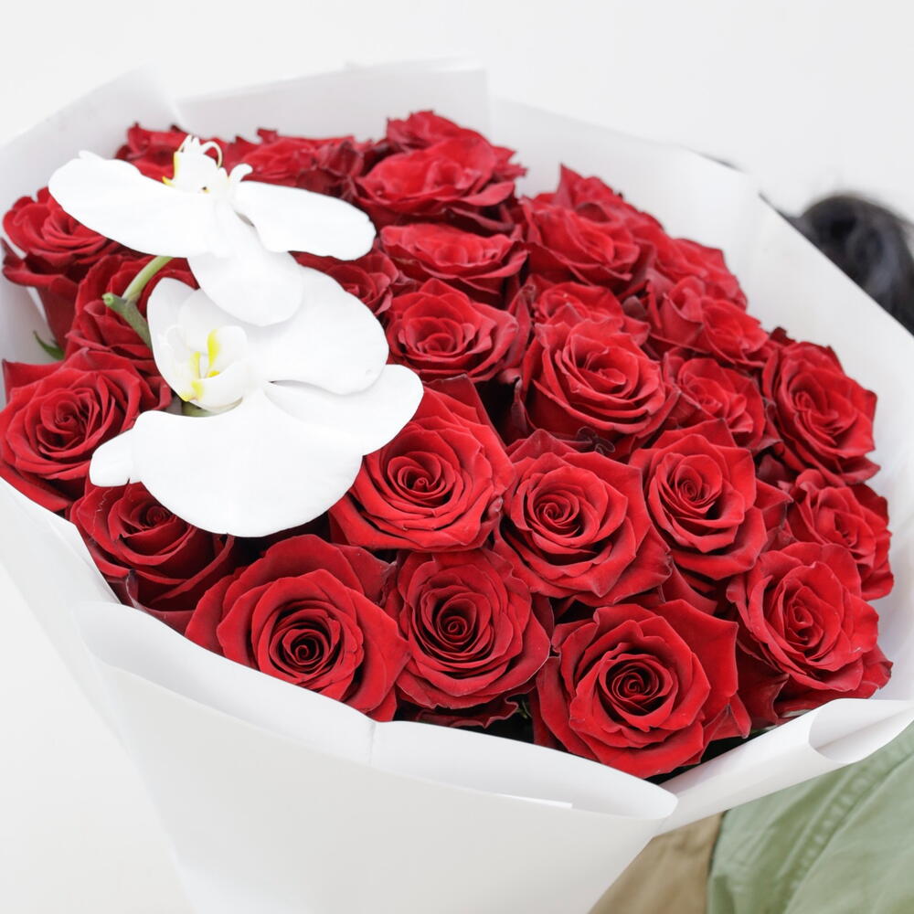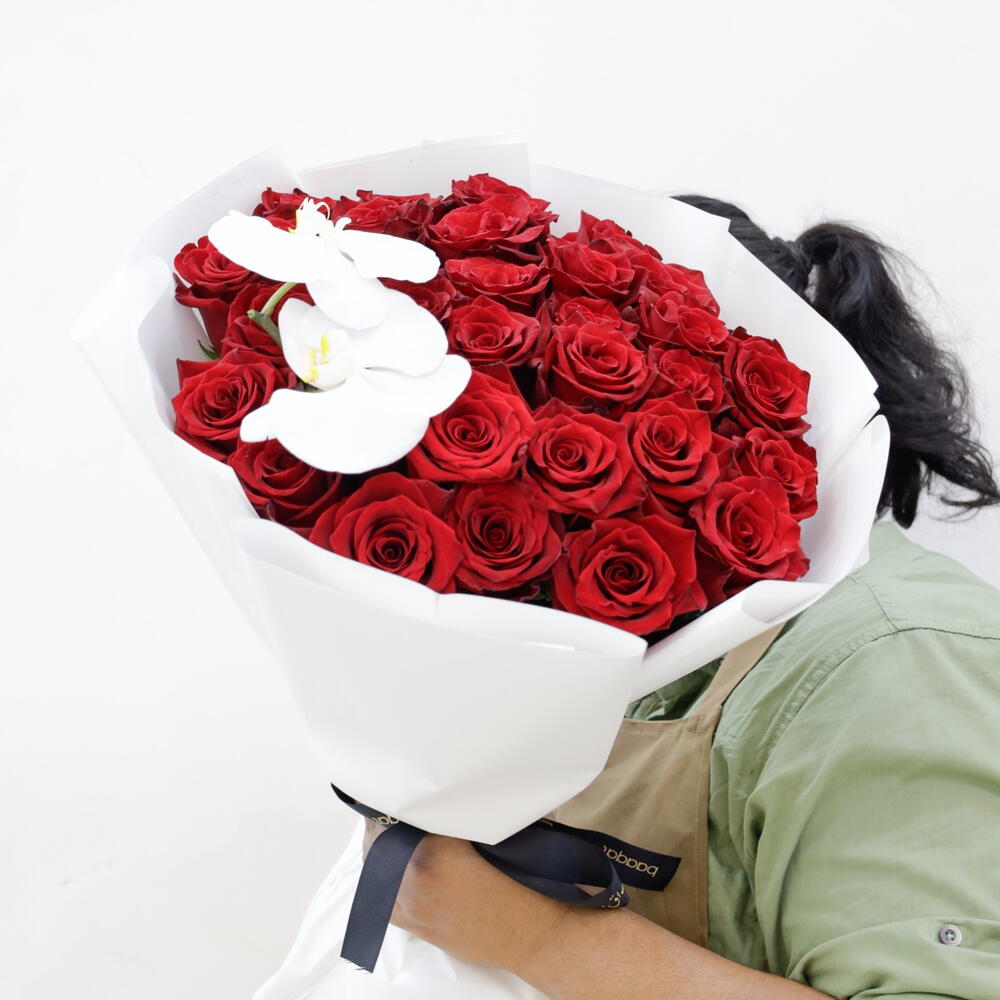 A statement of elegance and celebration. This premium bouquet features 31 hand-selected deep red roses, symbolizing respect and admiration, accented by the delicate grace of a pure white Phalaenopsis orchid. Wrapped in minimalist white parchment with a luxury satin ribbon, it is the perfect gesture for marking a major milestone, a promotion, or a significant achievement Flower Care Tips To keep this bouquet looking fresh for as long as possible, follow these steps: 1. Trim the Stems: Before placing them in a vase, cut about 2cm off the bottom of each stem at a 45-degree angle. This increases the surface area for water absorption. 2. Clean Water is Key: Use a clean vase filled with room-temperature water. Change the water every 2 days to prevent bacterial growth. 3. Remove Submerged Leaves: Ensure there are no leaves touching the water inside the vase, as they will decay and shorten the life of the roses. 4. Avoid Direct Heat: Keep the bouquet away from direct sunlight, air conditioning vents, and ripening fruit (which releases gases that make flowers wilt faster). 5. Orchid Care: Orchids are delicate. Avoid touching the petals of the white orchid, as the oils from your skin can cause them to bruise or spot.