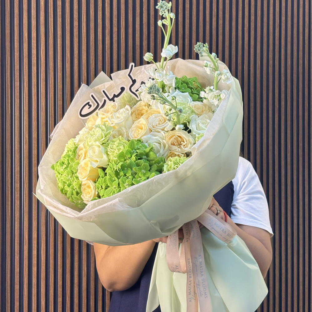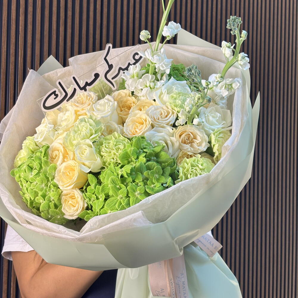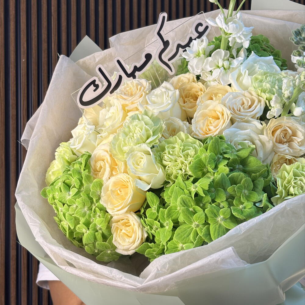 A breath of fresh air for the holiday season. The Emerald Peace features a serene blend of pristine white roses, lime-green hydrangeas, and delicate white stocks for added height and texture. Wrapped in a contemporary mint-green cloud of paper and finished with a bespoke "Eid Mubarak" topper, this bouquet symbolizes new beginnings and tranquility.