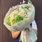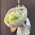 hydrangea green - 3 pcs flower bag - 1 pcs carnation green - 7 pcs mathiola white - 3 pcs spray rose solinero - 7 pcs flower food pack - 1 pcs rose nova vita - 10 pcs acrylic eid topper - 1 pcs