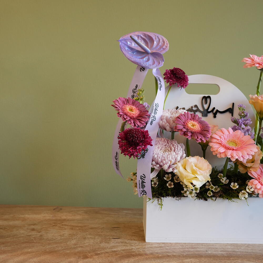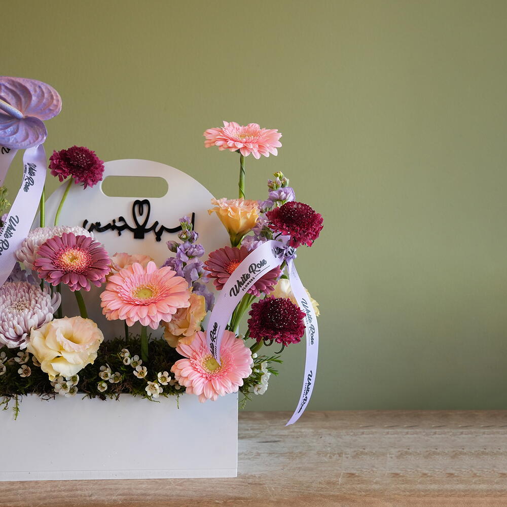 Combination of Anthurium, Lisianthus, Gerbera and other mix of flowers arranged in a Leather Bag.