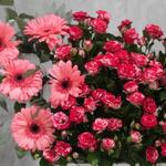 The bouquet is composed of pink gerbera daisies and a cluster of smaller, reddish-pink spray roses. The arrangement features several large, pink gerbera daisies with dark centers on the left side. On the right, there is a dense grouping of smaller, reddish-pink flowers, which appear to be spray roses. Green foliage is visible throughout the bouquet, providing a contrast to the flowers. The vase is a simple, modern white rectangular container, and the background is a neutral gray with a textured appearance.