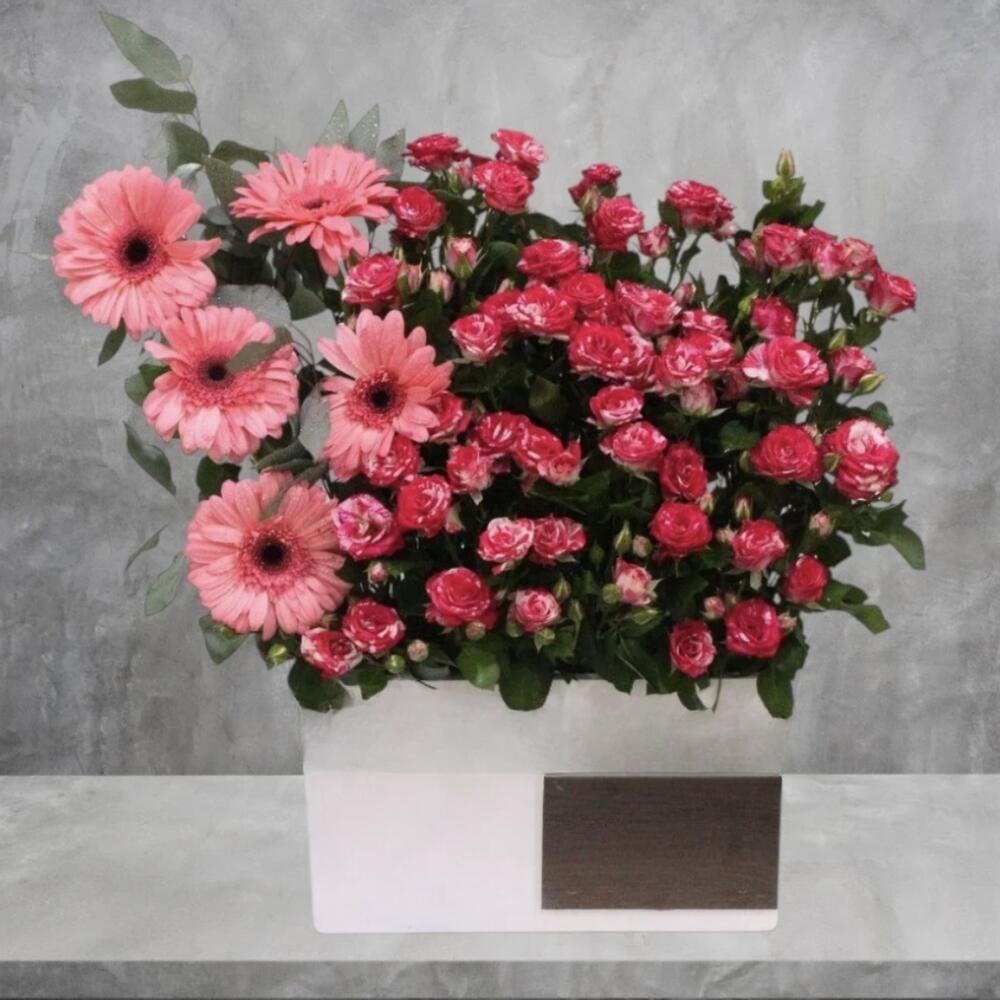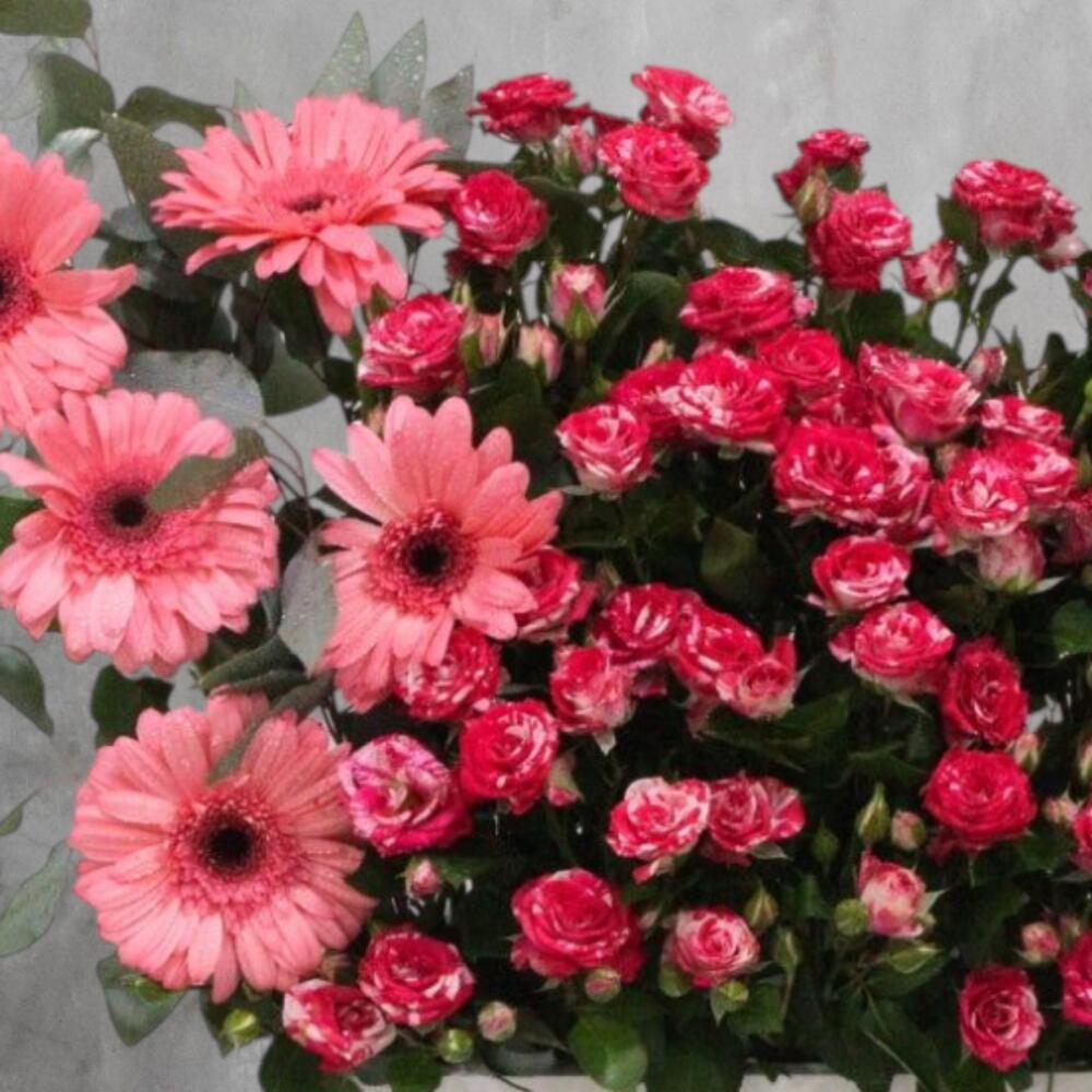 The bouquet is composed of pink gerbera daisies and a cluster of smaller, reddish-pink spray roses. The arrangement features several large, pink gerbera daisies with dark centers on the left side. On the right, there is a dense grouping of smaller, reddish-pink flowers, which appear to be spray roses. Green foliage is visible throughout the bouquet, providing a contrast to the flowers. The vase is a simple, modern white rectangular container, and the background is a neutral gray with a textured appearance.