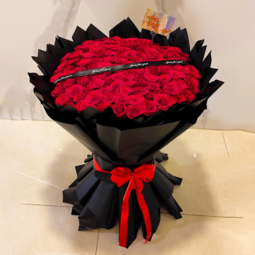 black wrapping - 1 pcs red roses - 101 pcs customized ribbon - 1 pcs