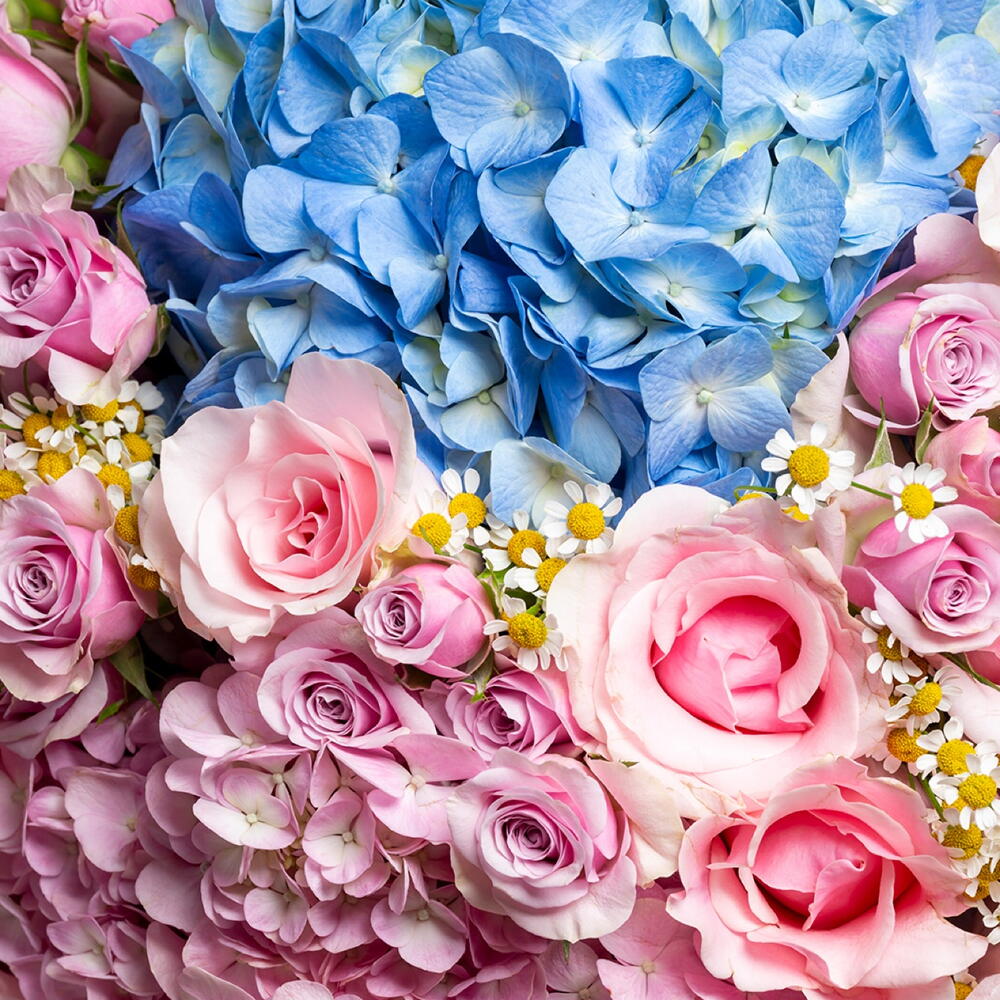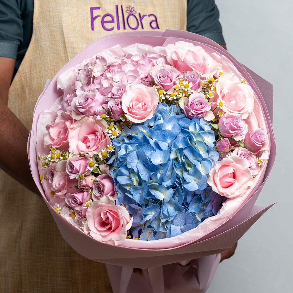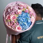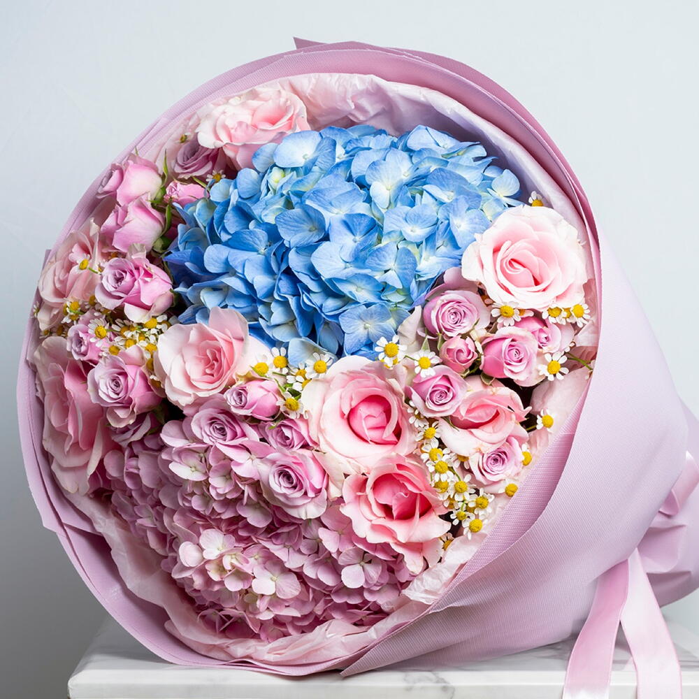 Ribbon - 1 pcs Pink rose - 8 pcs purple rose - 5 pcs wrapping paper - 5 pcs pink hydrangea - 1 pcs tanacetum spray daisy - 5 pcs blue hydreangea - 1 pcs