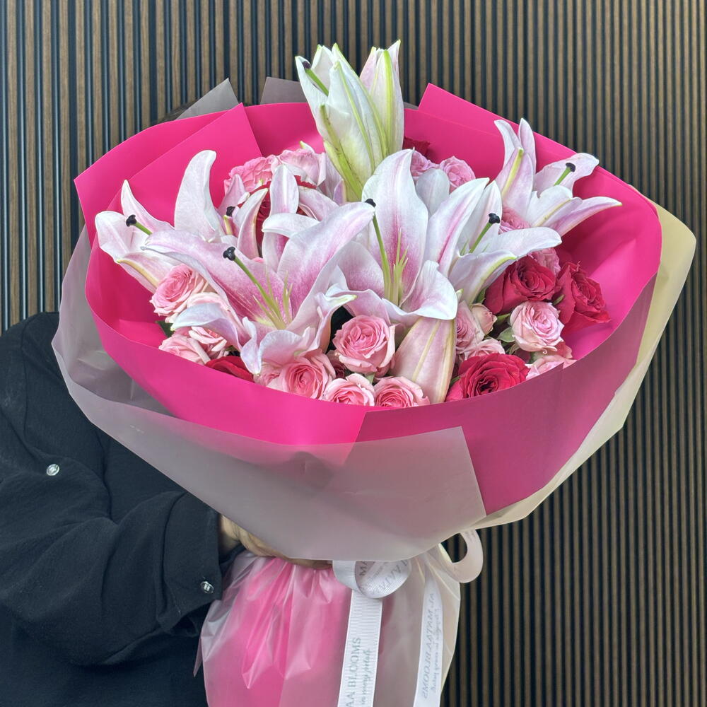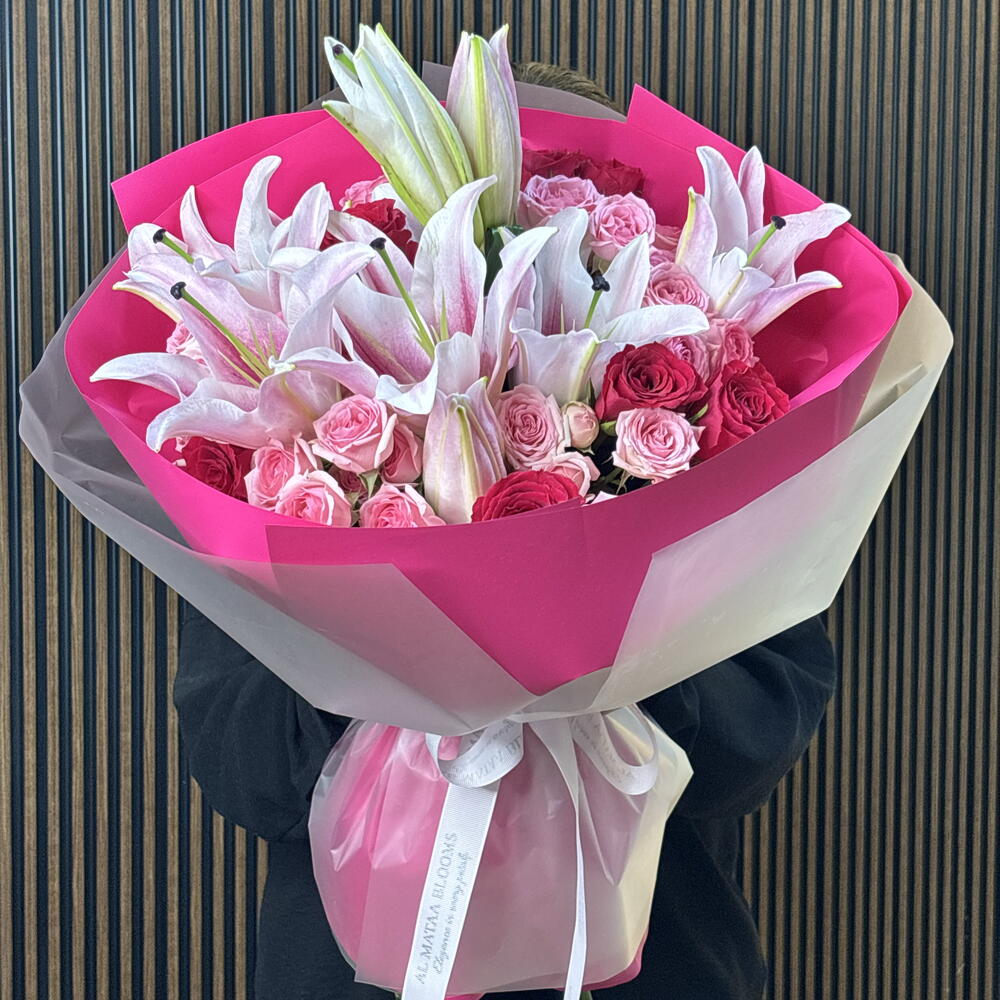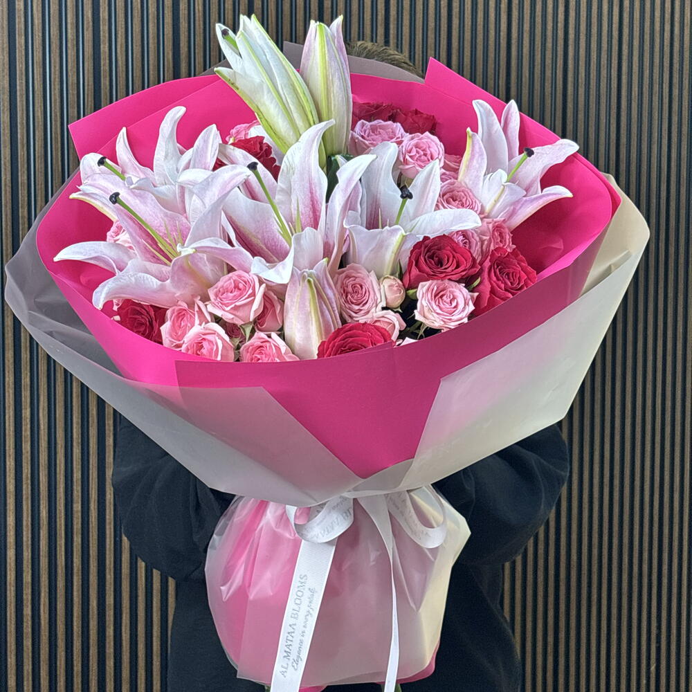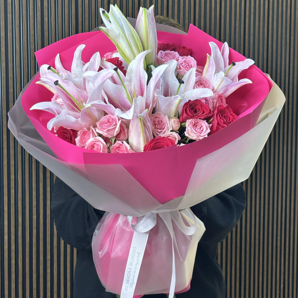 A bold and high-energy floral statement, this bouquet celebrates the vibrant spectrum of pink. The centerpiece features majestic Oriental pink lilies that command attention with their architectural beauty, complemented by the intense, deep tones of fuchsia pink roses. Delicate Dinara spray roses add a layer of fine texture, creating a voluminous and modern silhouette. Wrapped in a striking hot-pink and frosted white sculptural wrap and finished with a signature satin ribbon, this arrangement is designed for those who appreciate high-end, vivid aesthetics.