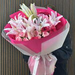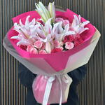 flower bag - 1 pcs oriental pink lilies - 3 pcs spray rose dinara pink - 7 pcs fuchsia roses - 7 pcs flower food pack - 1 pcs