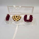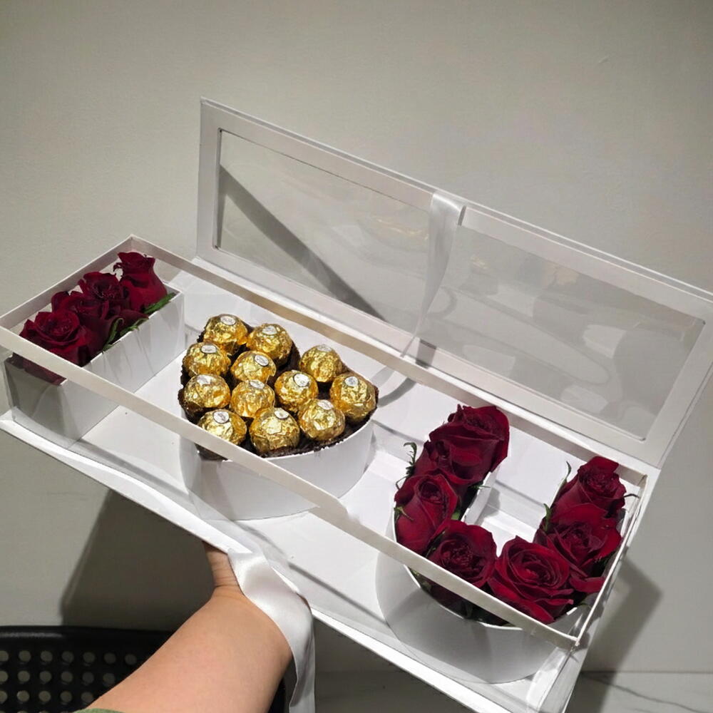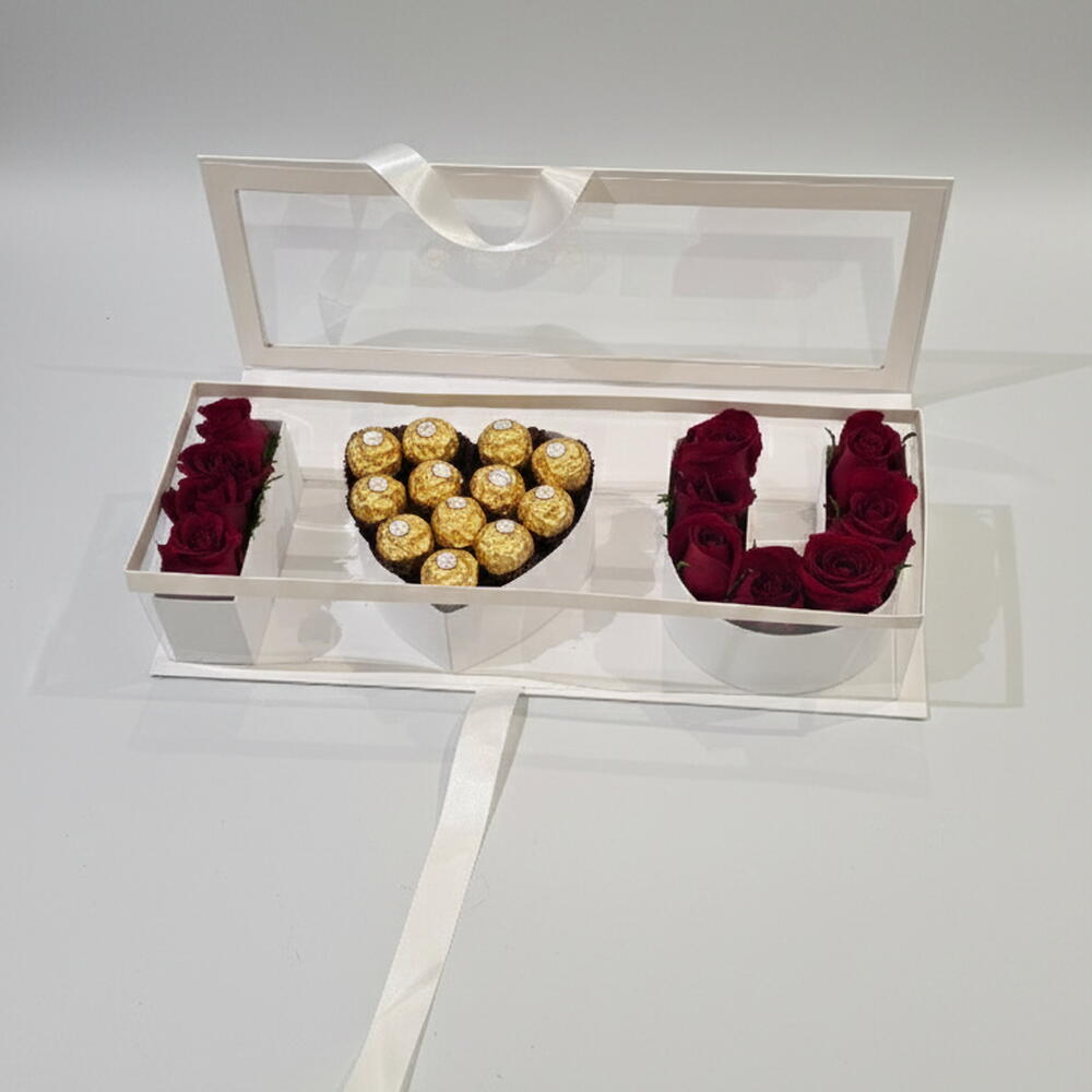 Make the ultimate romantic statement with our exclusive I Love U Signature Gift Box. Measuring 44.5x15.5cm with a sleek 10cm height, this premium white display box features a clear viewing window to reveal a stunning three-part arrangement: The I: A dedicated section of 4 to 6 premium deep red roses. The Heart: A center heart-shaped box filled with 10 to 12 luxury gold-wrapped Ferrero Rocher chocolates. The U: A final elegant display of 6 to 8 fresh red roses. Essential Rose Care Guide Hydration: Carefully add a small amount of water to the base of the rose sections every 2 days using a narrow spout. Environment: Keep your gift box in a cool, dry place away from direct sunlight, heating vents, or air conditioning drafts. Avoid Misting: Do not spray water directly onto the rose petals or the chocolate heart, as this can cause spotting or damage. Longevity: Keep the lid open occasionally for air circulation and remove any petals that begin to wilt to keep the arrangement fresh.