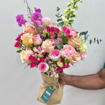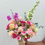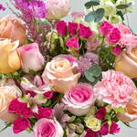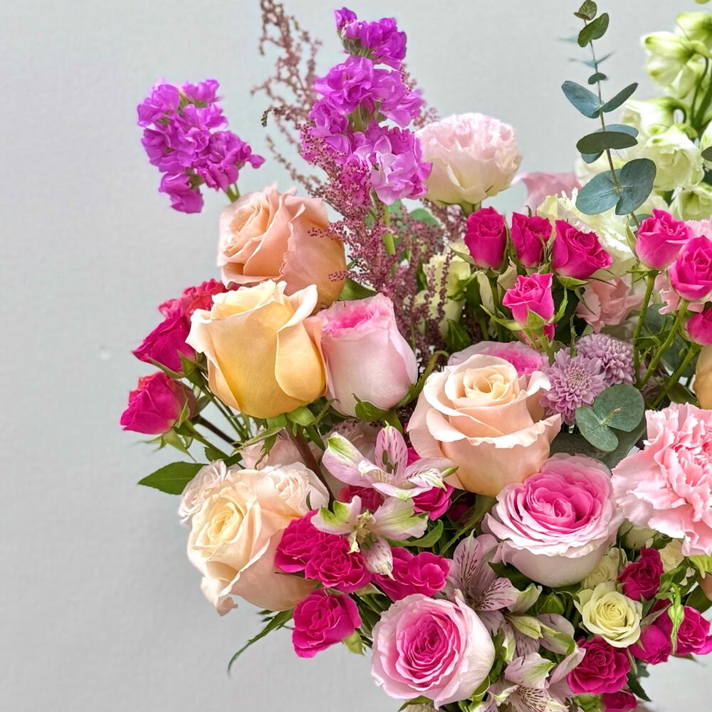 Eucalyptus - 4 pcs carnation pink - 3 pcs spray rose white - 4 pcs astilbe pink - 1 pcs mathiola pink - 2 pcs lisianthus peach - 4 pcs dilphinium white - 1 pcs alstroemeria pink - 2 pcs spray rose fuschia - 5 pcs shimmer roses - 6 pcs