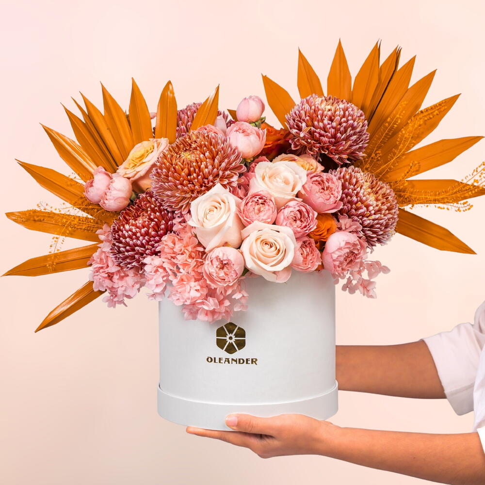 rose - 5 pcs orange rose - 4 pcs mums - 5 pcs juliata - 4 pcs preserved hydrangea pink - 2 pcs washingtonio leaf - 2 pcs preserved - 1 pcs