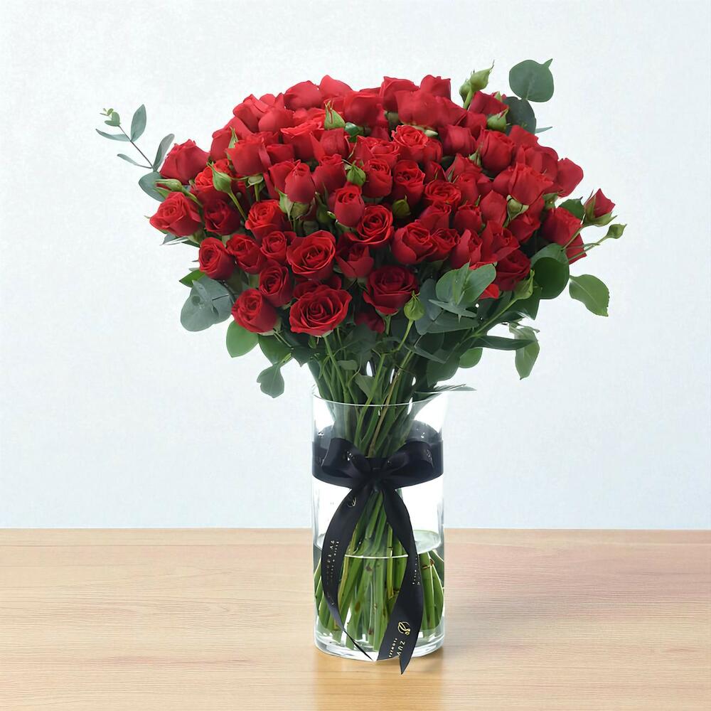 Expertly presented in a sleek cylindrical glass vase, it’s a thoughtful and lasting display piece, perfect for anniversaries, romantic surprises, or special milestones. Designed for beauty from every angle, this floral creation makes a striking centerpiece for home or event settings.