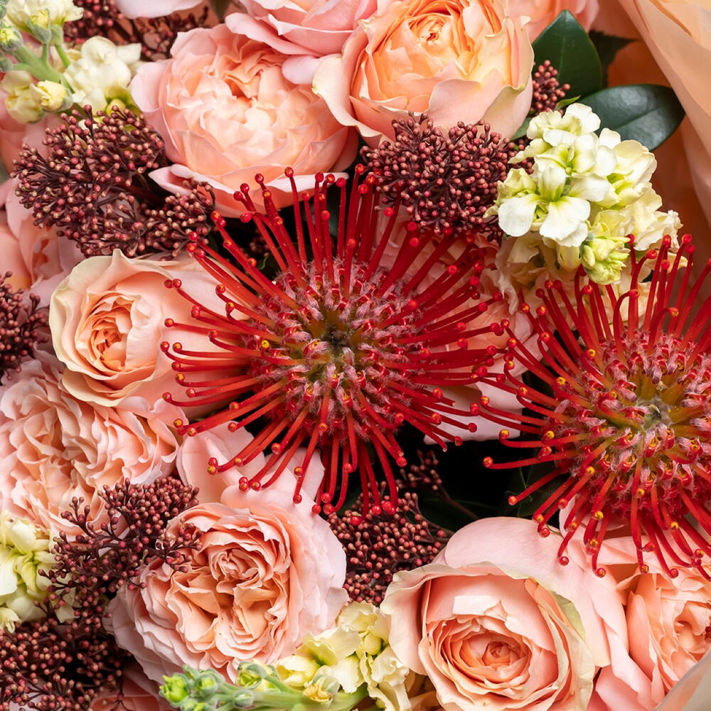 Ribbon - 1 pcs juliet rose - 6 pcs wrapping paper - 5 pcs mathiola white - 5 pcs skimmia (rubella) - 5 pcs nutans - 3 pcs
