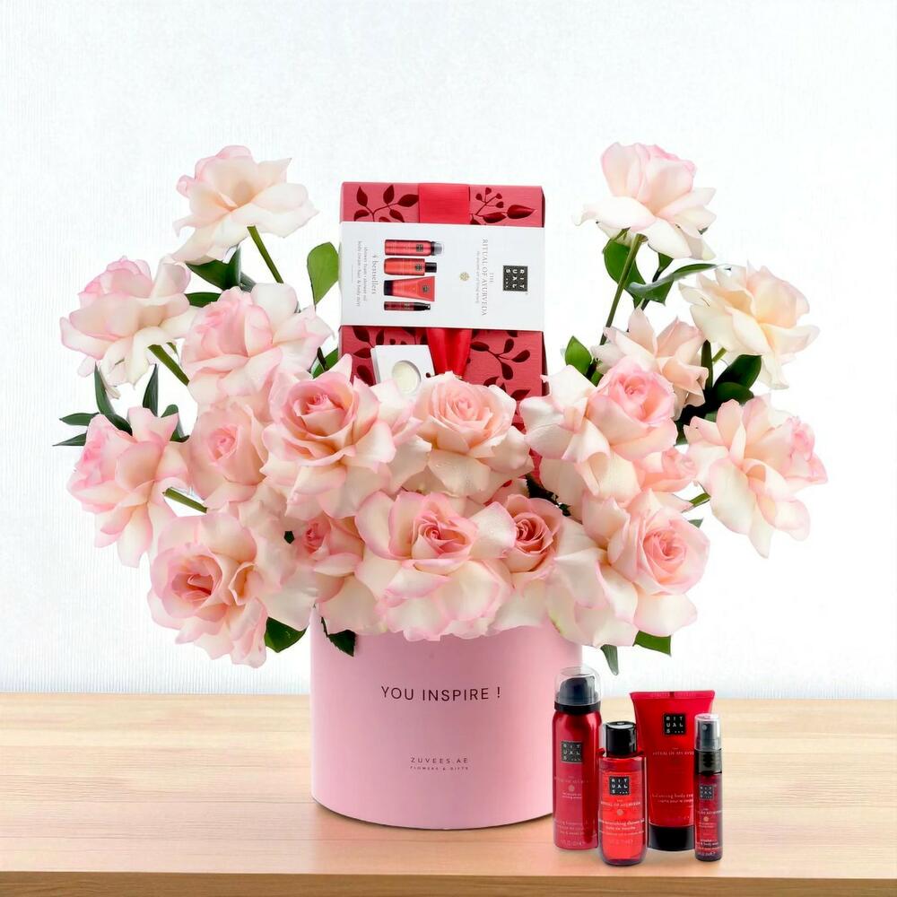 Includes: Rituals of Ayurveda gift set featuring body foam, scrub, oil, and mist. Elevate your gifting experience with The Pink Empress Box – Rituals of Ayurveda Combo, a harmonious blend of natural floral beauty and wellness indulgence. This stunning arrangement of soft pink Esperance roses is elegantly paired with the luxurious Rituals of Ayurveda gift set – a collection designed to restore balance and bring inner peace. Whether youre expressing affection or encouraging self-care, this thoughtful ensemble brings tranquility, beauty, and grace into every moment.