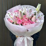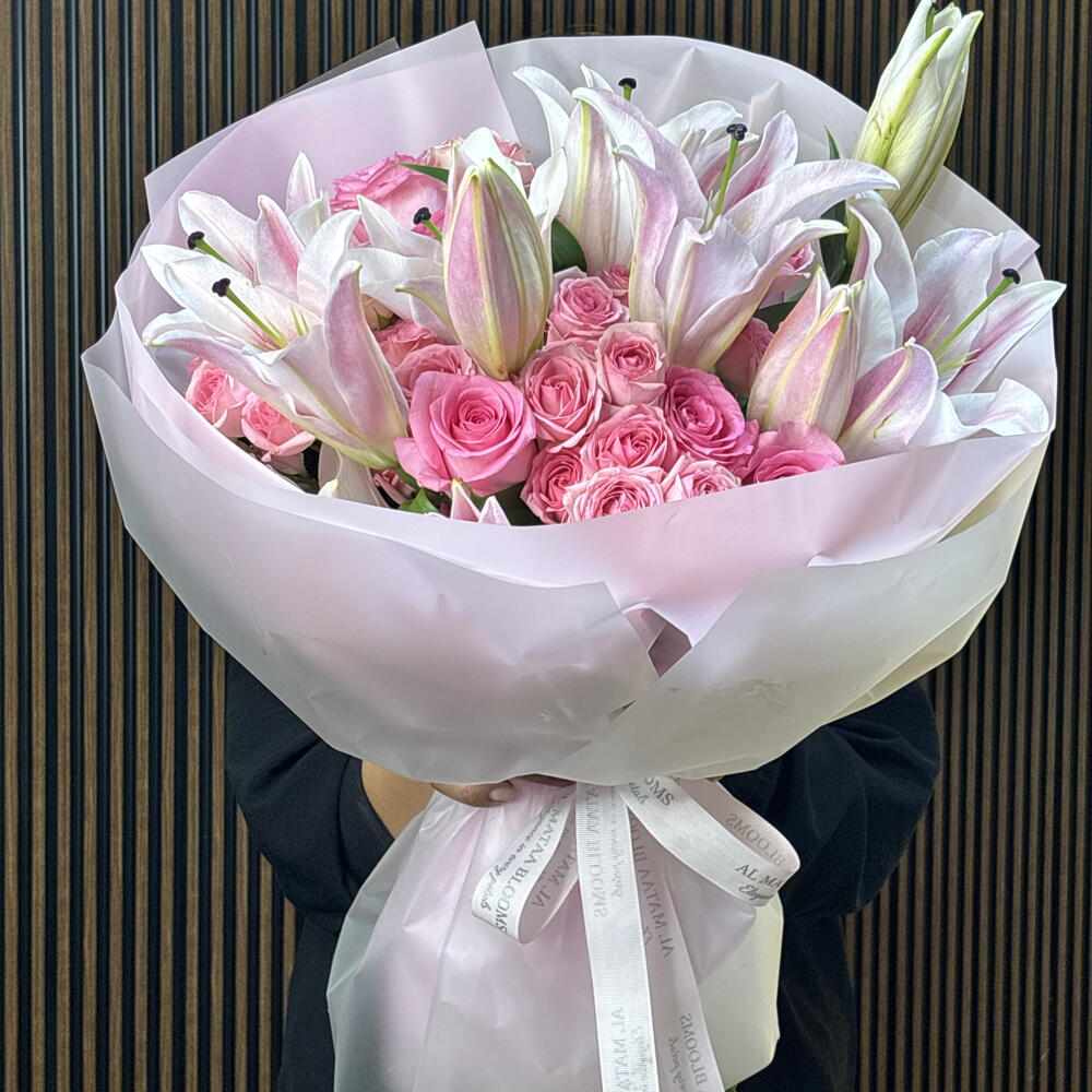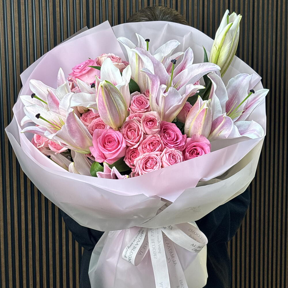 This stunning arrangement is a celebration of femininity and grace, offering a multi-tonal journey through the most beautiful shades of pink. The grand Oriental pink lilies, with their delicate star-shaped blooms, create a majestic frame for a lush heart of Revival pink roses and dainty Dinara spray roses. Wrapped in a soft blush-pink sculptural wrap and finished with a signature satin ribbon, this voluminous bouquet is the epitome of luxurious romanticism.