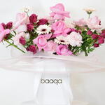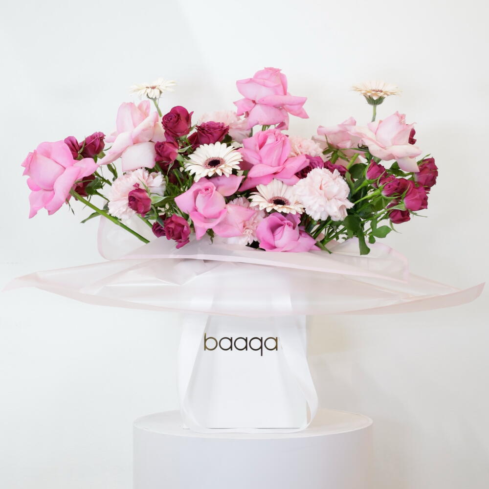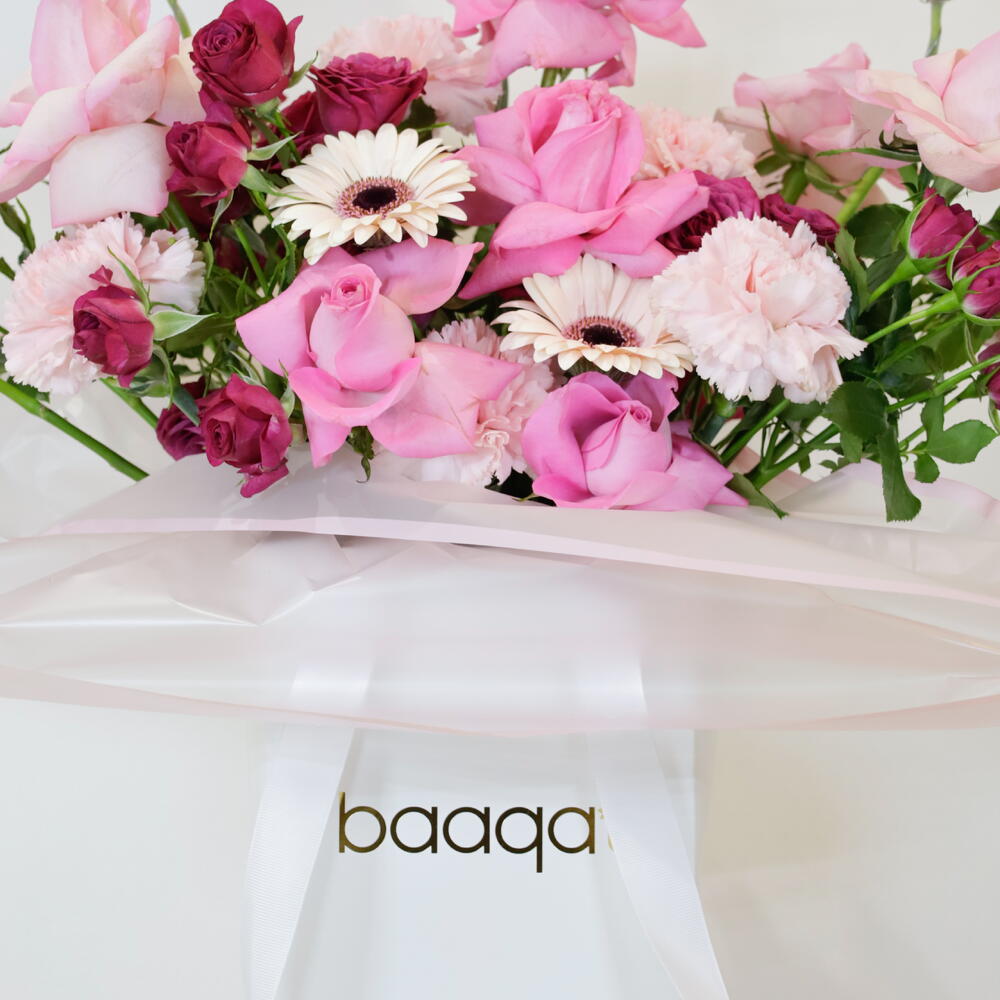 Indulge someone special with our enchanting Pink Petal Mix, a luxurious arrangement expertly designed to celebrate beauty and affection. This hand-tied bouquet is a symphony of pinks, featuring lush blooms from soft blush to rich berry Premium Pink Roses: Large, velvety blooms representing deep love and gratitude. Deep Magenta Spray Roses: Clusters of smaller, darker roses that add a rich, dramatic pop of color. Delicate White Pink Carnations: Frilly, layered flowers that provide soft texture and volume. Cheery Gerbera Daisies: Bright, focal flowers that bring a touch of joy and purity to the design Flower Care Instructions Immediate Care: Remove the bouquet from the baaqah bag, keeping the original wrapping around the stems intact. Water: Fill a clean vase with fresh, cool tap water and add the included flower food (if provided). Trim Stems: Using a sharp knife or shears, cut 1-2 cm off the bottom of each stem at a 45-degree angle. This allows the flowers to drink water easily. Display Location: Place the vase away from direct sunlight, heat sources (like radiators or appliances), and drafts (like air conditioners or open windows). A cool, shaded area is best. Daily Refresh: Change the water and re-cut the stems every two days. Always ensure the water is clean and free of leaves.