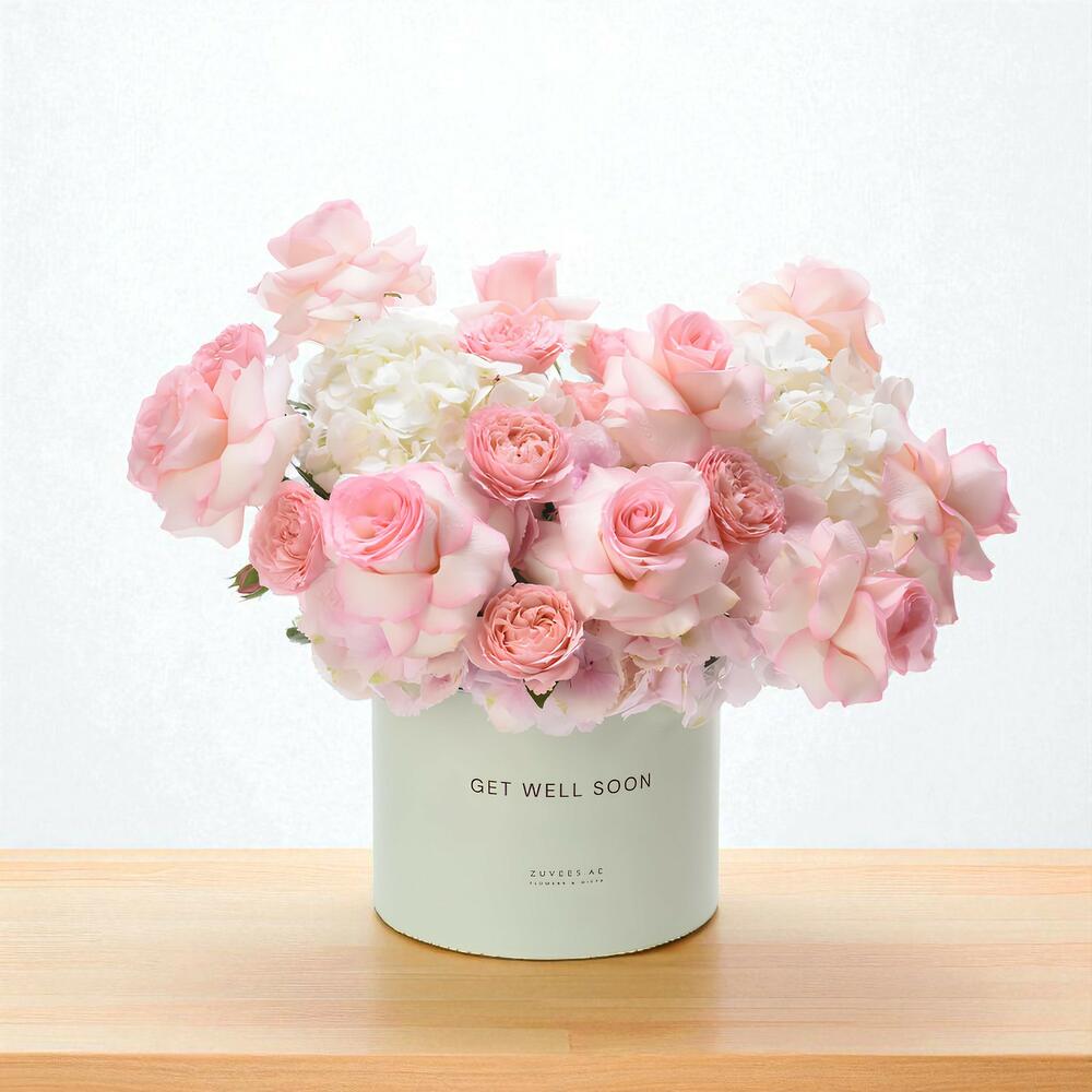 Experience the captivating elegance of the The Pink Taffy Get Well Soon Box, a luxurious floral occasion box designed to offer comfort and encouragement during recovery. Expertly crafted with dimensions of Width - 55 and Height - 43, this box features the phrase Get Well Soon elegantly inscribed, presented in a soothing pistachio-colored design that radiates hope and warmth.