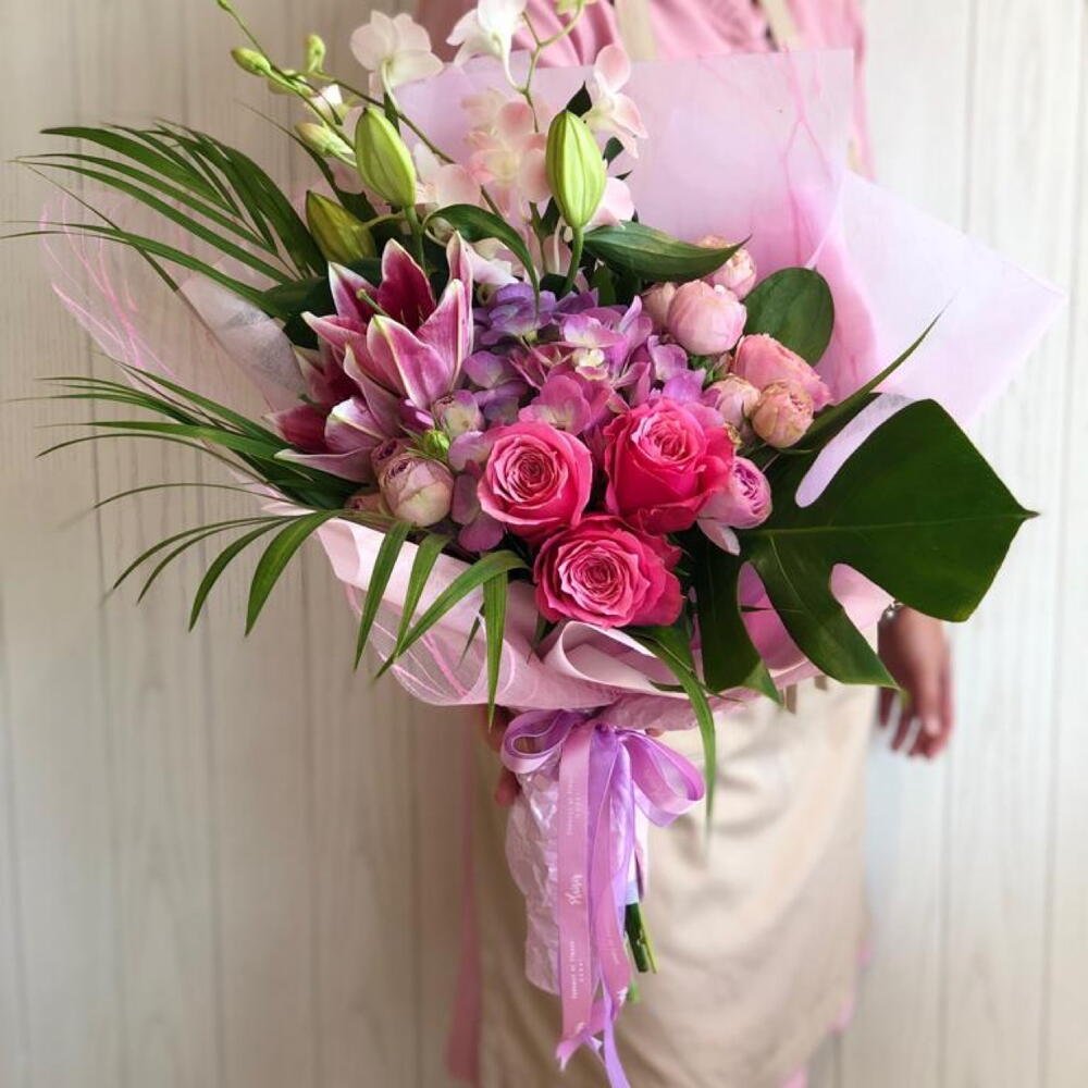 Lily - 2 pcs hydrangeas - 3 pcs roses - 5 pcs spray roses - 3 pcs monstera leaf - 1 pcs palm cane - 2 pcs dendrobiums - 2 pcs