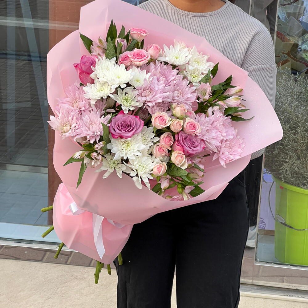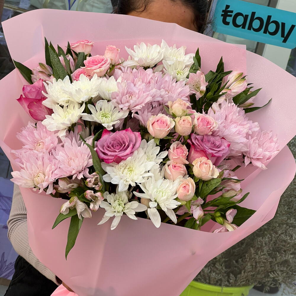A graceful mix of white and pink chrysanthemums, purple roses, and alstroemeria. Finished with dainty baby roses and a soft pink wrap, this elegant bouquet is a perfect tribute to her beauty and strength this Women’s Day.