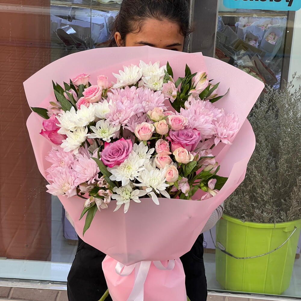 Chrysanthemum - 6 pcs Alstroemeria - 4 pcs baby roses - 3 pcs purple roses - 3 pcs