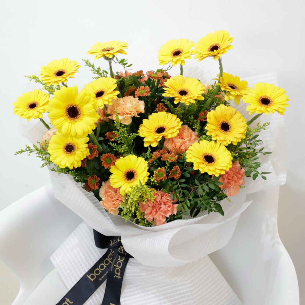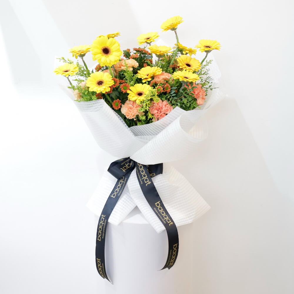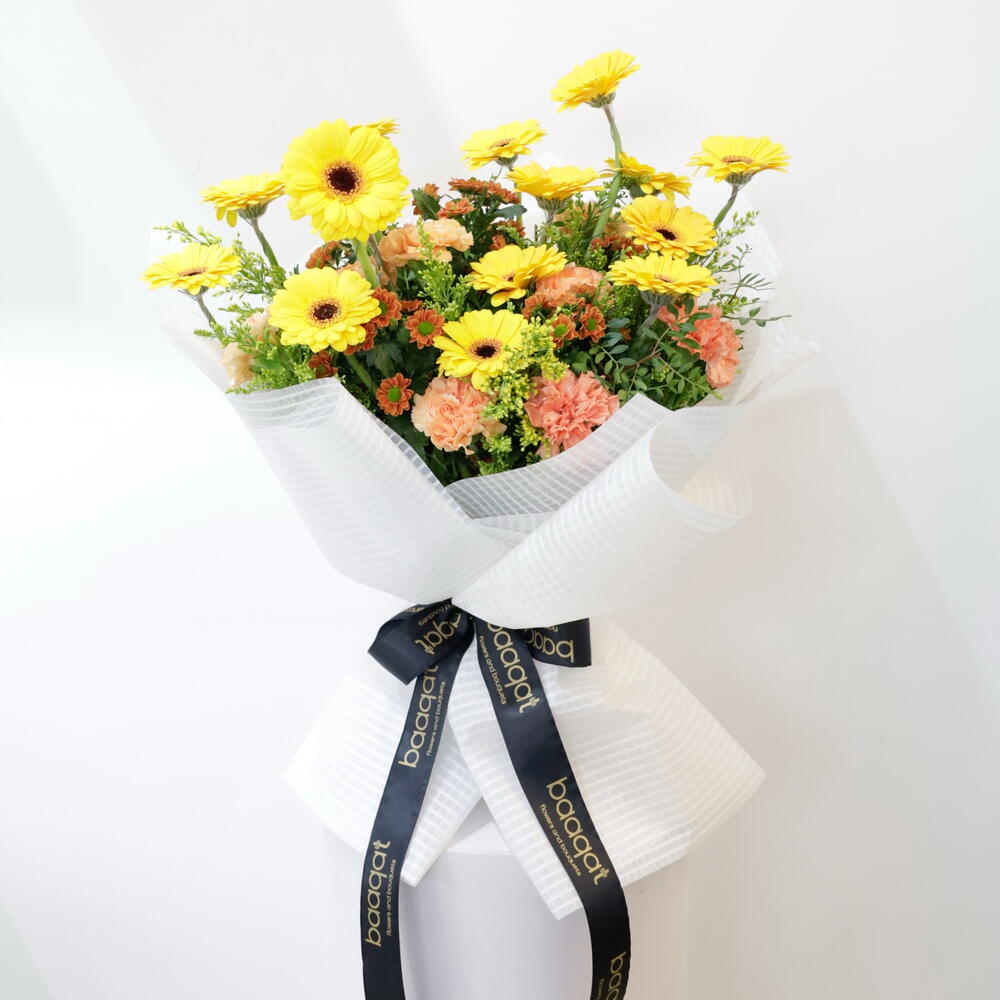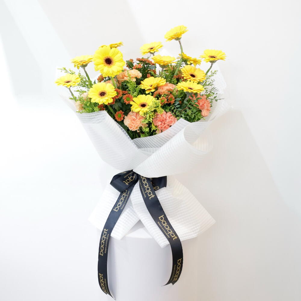 Brighten someone’s day with the ultimate symbol of joy! This vibrant hand-tied bouquet features premium Yellow Gerbera Daisies as the star of the show, complemented by soft Peach Carnations and delicate filler greens. Wrapped in a sophisticated white textured mesh and finished with our signature baaqat ribbon, this arrangement is perfect for birthdays, get well soon wishes, or simply to celebrate a friendship. Its warm, sunny palette brings a touch of natures light into any room. Primary Flowers: Yellow Gerbera Daisies Secondary Flowers: Peach Carnations, Green Ruscus/Solidago fillers Style: Modern, Round Hand-Tied Occasions: Birthday, Anniversary, Graduation, or Thank You Flower Care : To ensure your baaqat bouquet stays fresh and vibrant for as long as possible, please follow these tips: 1- Trim the Stems: Cut about 2cm off the bottom of each stem at a 45-degree angle before placing them in a vase. 2- Fresh Water: Use a clean vase with room-temperature water. Gerbera daisies prefer shallow water (about 5-10cm) to prevent stem rot. 3- Clean the Vase: Change the water every 2 days and give the stems a fresh trim each time. 4- Avoid Heat: Keep the flowers in a cool spot away from direct sunlight, air conditioning vents, and ripening fruit (which releases gases that make flowers wilt faster). 5- Remove Wilted Petals: If a specific flower begins to fade, remove it to keep the rest of the arrangement healthy.
