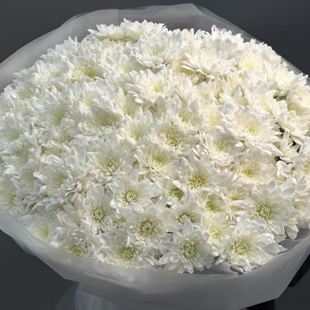 This large, dome-shaped bouquet is designed for maximum visual impact through repetition and volume. Unlike the previous mixed bouquet, this arrangement focuses on a single flower type to create a textured, carpet-like surface. Minimalist Wrapping: The flowers are encased in layers of semi-translucent frosted white film. This choice complements the monochromatic theme and allows the bouquet to feel like a singular, glowing object.