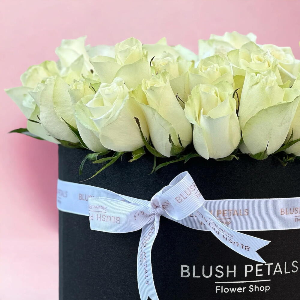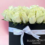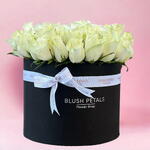 An elegant fresh 50 white roses arrangement to show your love. Arranged artistically in a black box and delivered with love. Include your personal message on our complimentary card.