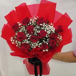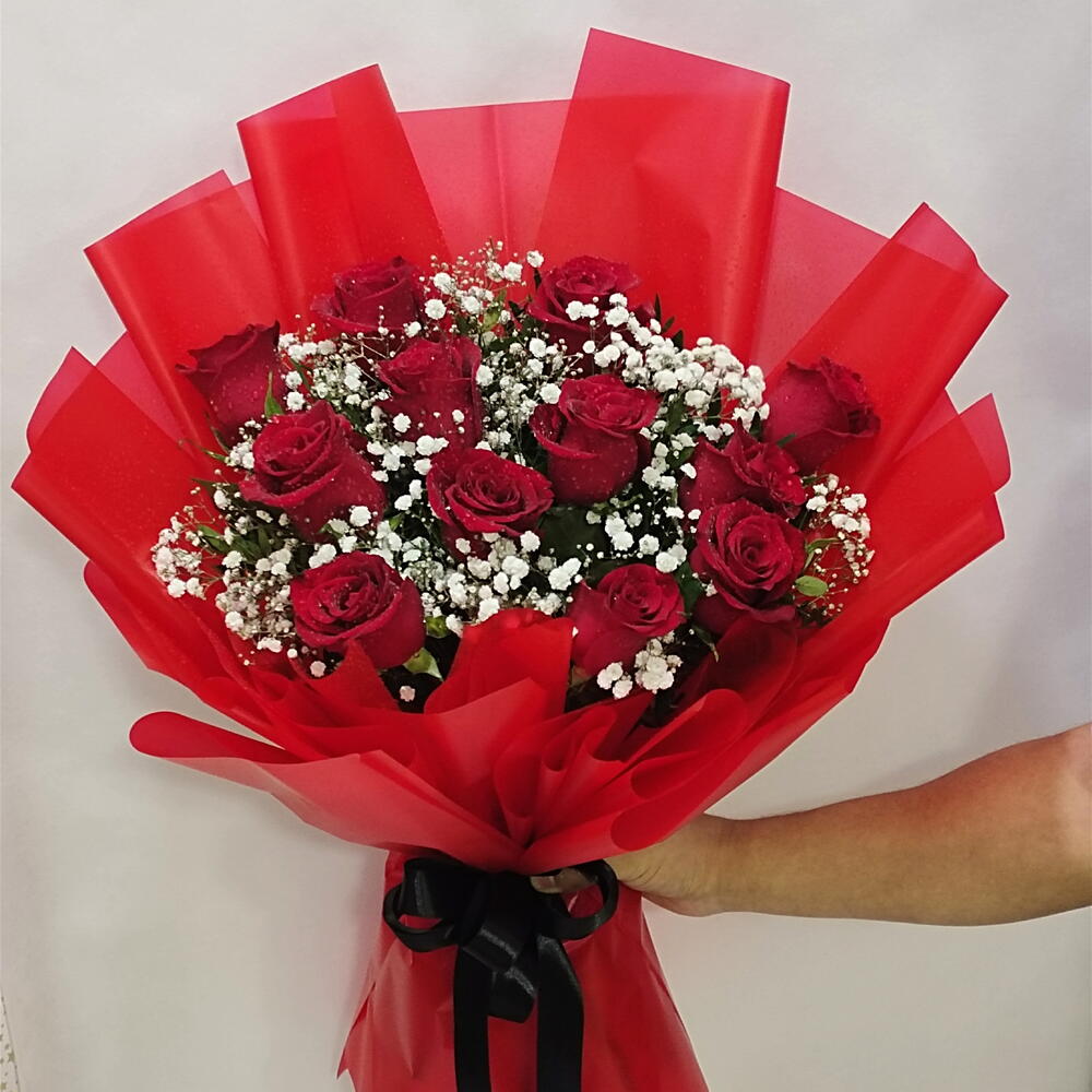 This classic hand-tied bouquet of 12 fresh long-stemmed red roses wrapped in lush greenery makes a simple and elegant statement, and is a must for the rose lover. Why not send these quality blooms to a deserving someone today? Bunch of 12 Red Roses with Gypsophelia in a nice wrraping