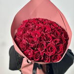 This elegant bouquet features 30 rich red roses, symbolizing love and passion, beautifully wrapped in soft pink mauve paper. The deep red of the roses contrasts beautifully with the subtle pink mauve wrap, creating a sophisticated and romantic look. The combination of vibrant blooms and gentle wrapping makes this bouquet a perfect expression of affection and admiration for any special occasion.