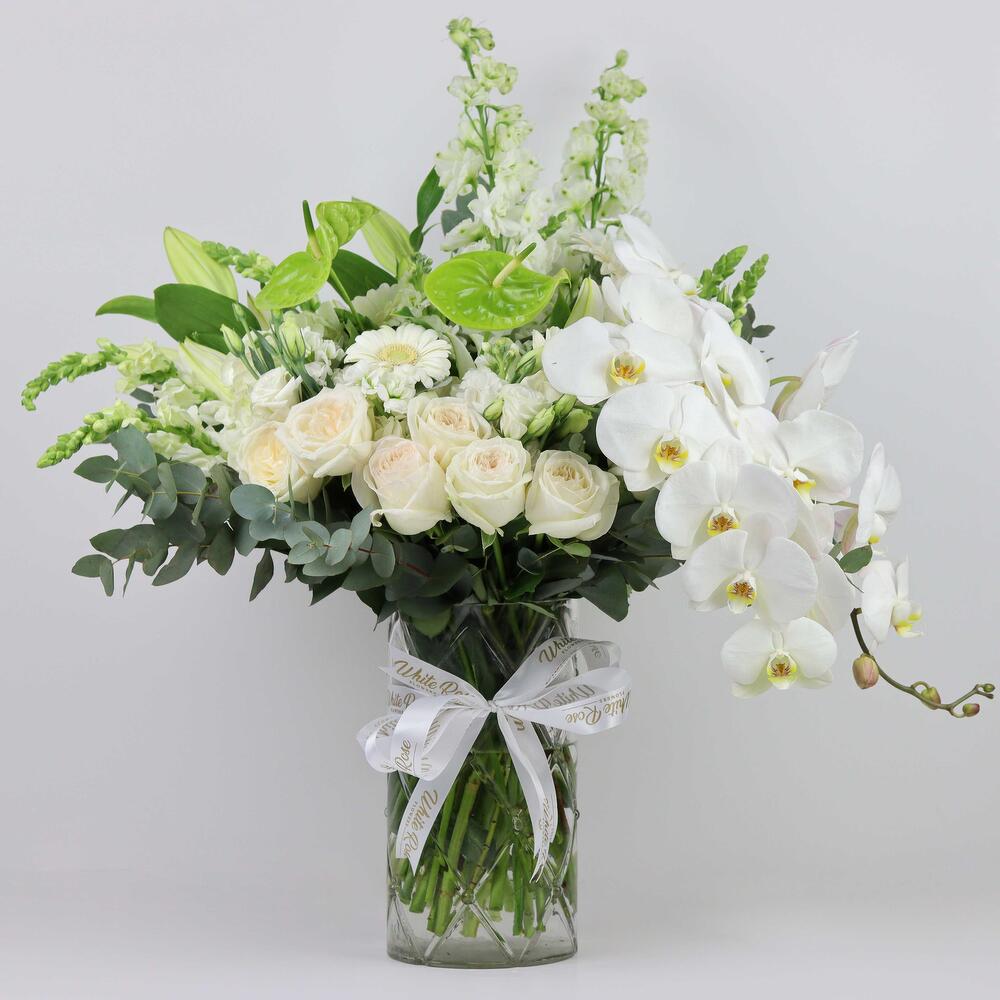 Gerbera - 2 pcs glass vase - 1 pcs delphinium - 4 pcs ohara - 6 pcs orchid bunch - 2 pcs