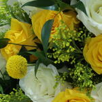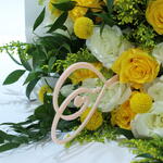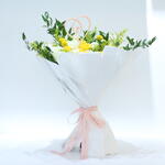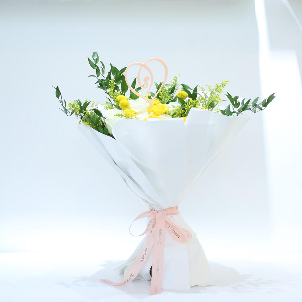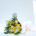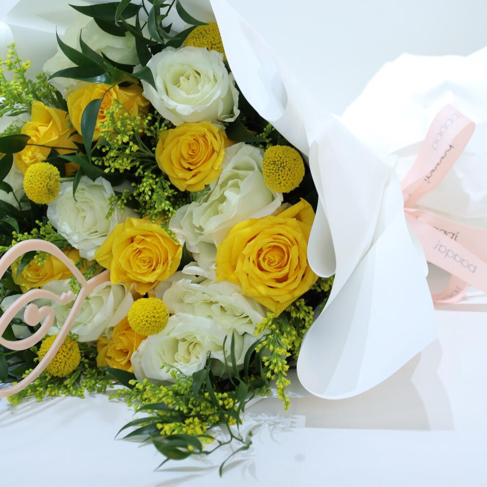 Solidago - 6 pcs craspedia - 6 pcs o’hara white - 8 pcs white wrapping paper - 12 pcs rascuss leaves - 5 pcs kenyan yellow rose - 8 pcs baaqat pink ribbon - 3 pcs