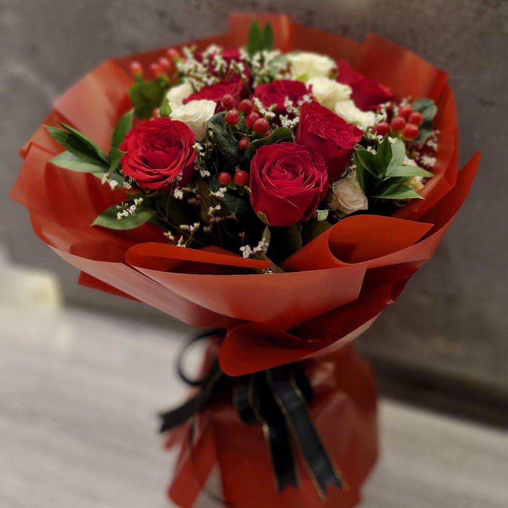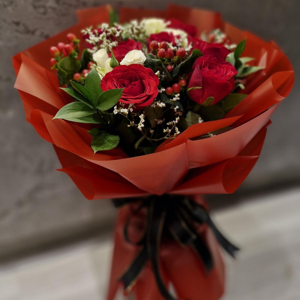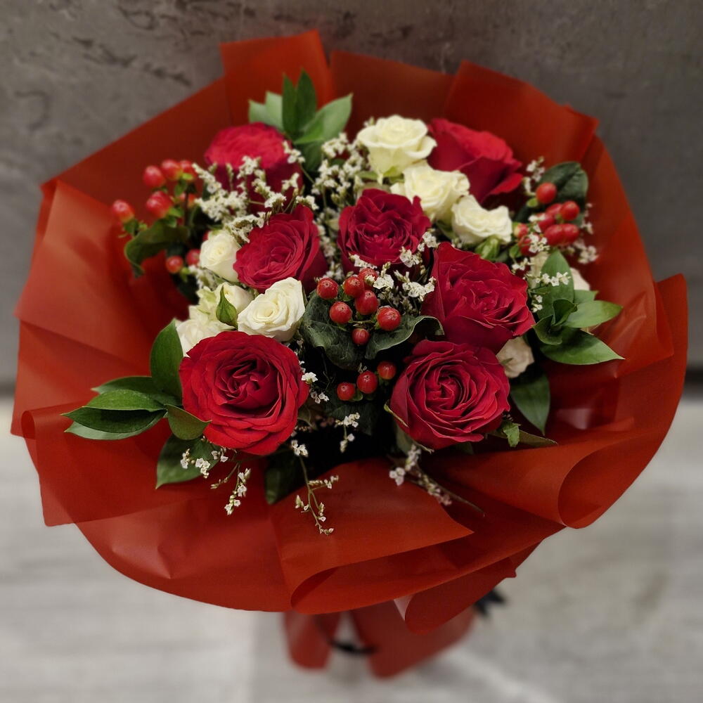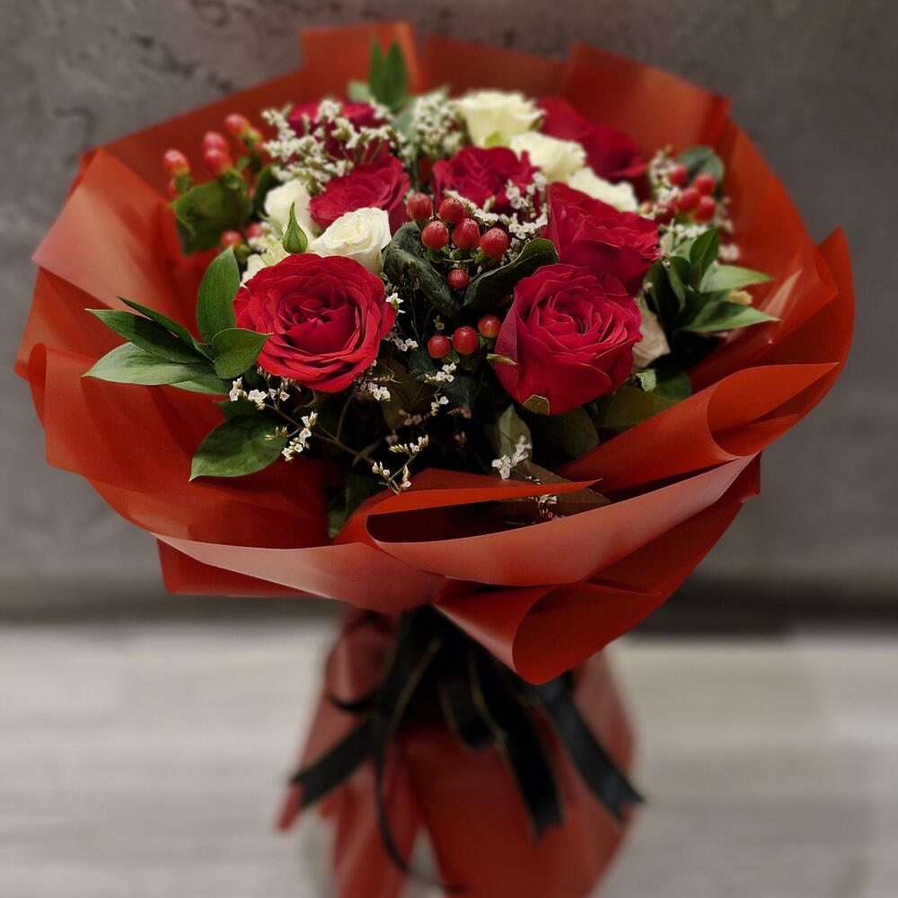 Red rose - 10 pcs gipsophila - 5 pcs white baby rose - 5 pcs rascuss leaves - 5 pcs