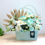 A charming arrangement of white and subtly blue-tinted roses and chrysanthemums, accented with babys breath, eucalyptus leaves, and decorative butterflies, presented in a light blue handled basket.