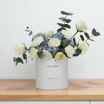 white carnations - 5 pcs blue hydrangea - 1 pcs white roses - 6 pcs fresh eucalyptus - 7 pcs