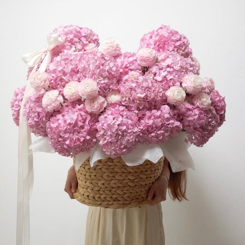 Treasure – 25 Pink Hydrangeas 20 ranunculus in Basket