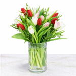 red tulips - 7 pcs pink tulips - 7 pcs white tulips - 7 pcs parvifolia leaves - 2 pcs cylinder glass - 1 pcs