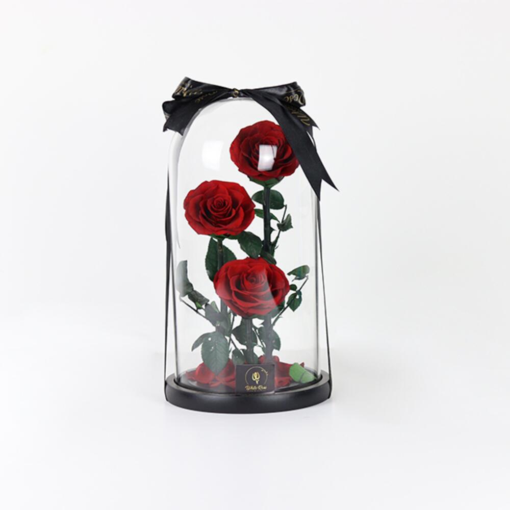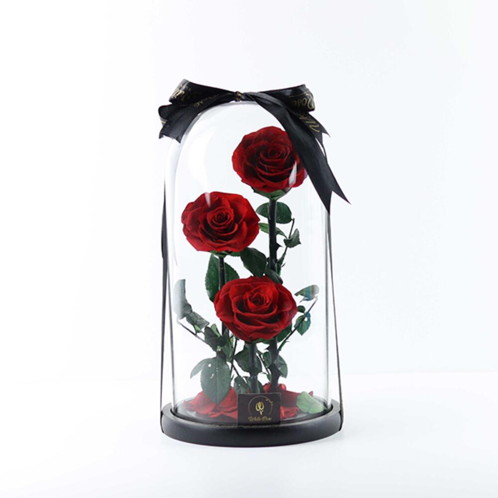Preserved Three Red roses arranged in a bell jar .