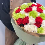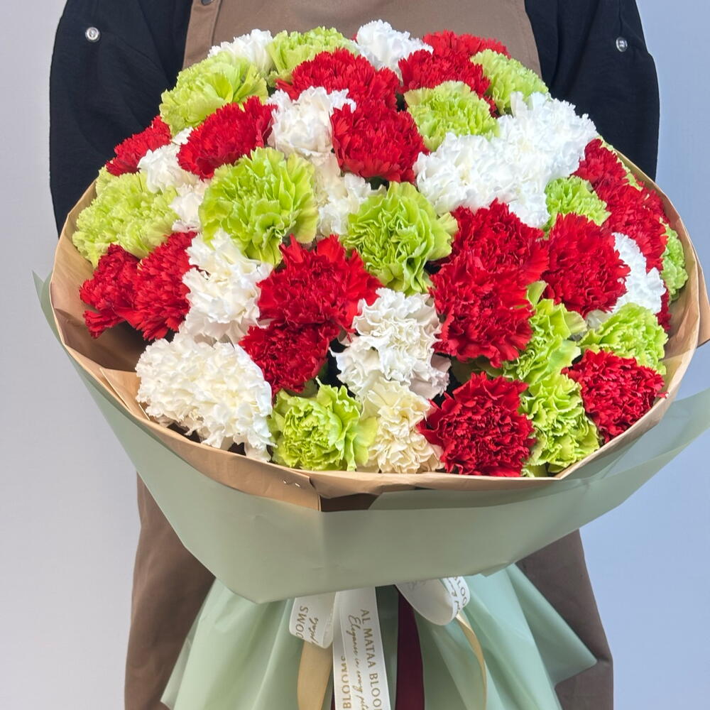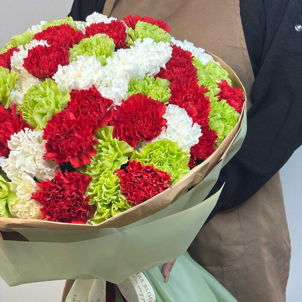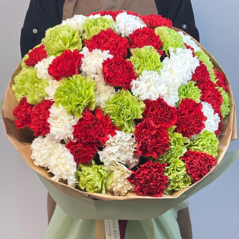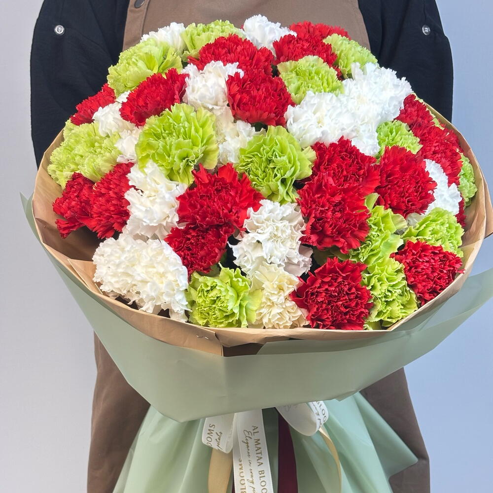 This massive bouquet is a celebration in every petal! A stunning mix of deep red, bright white, and fresh lime green carnations. Whether youre saying I love you, Happy Birthday, or Thinking of you, this tricolor sensation delivers maximum impact and long-lasting beauty.