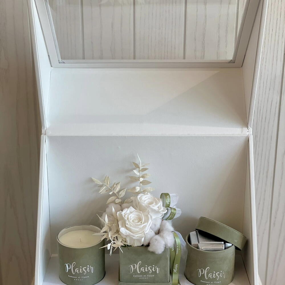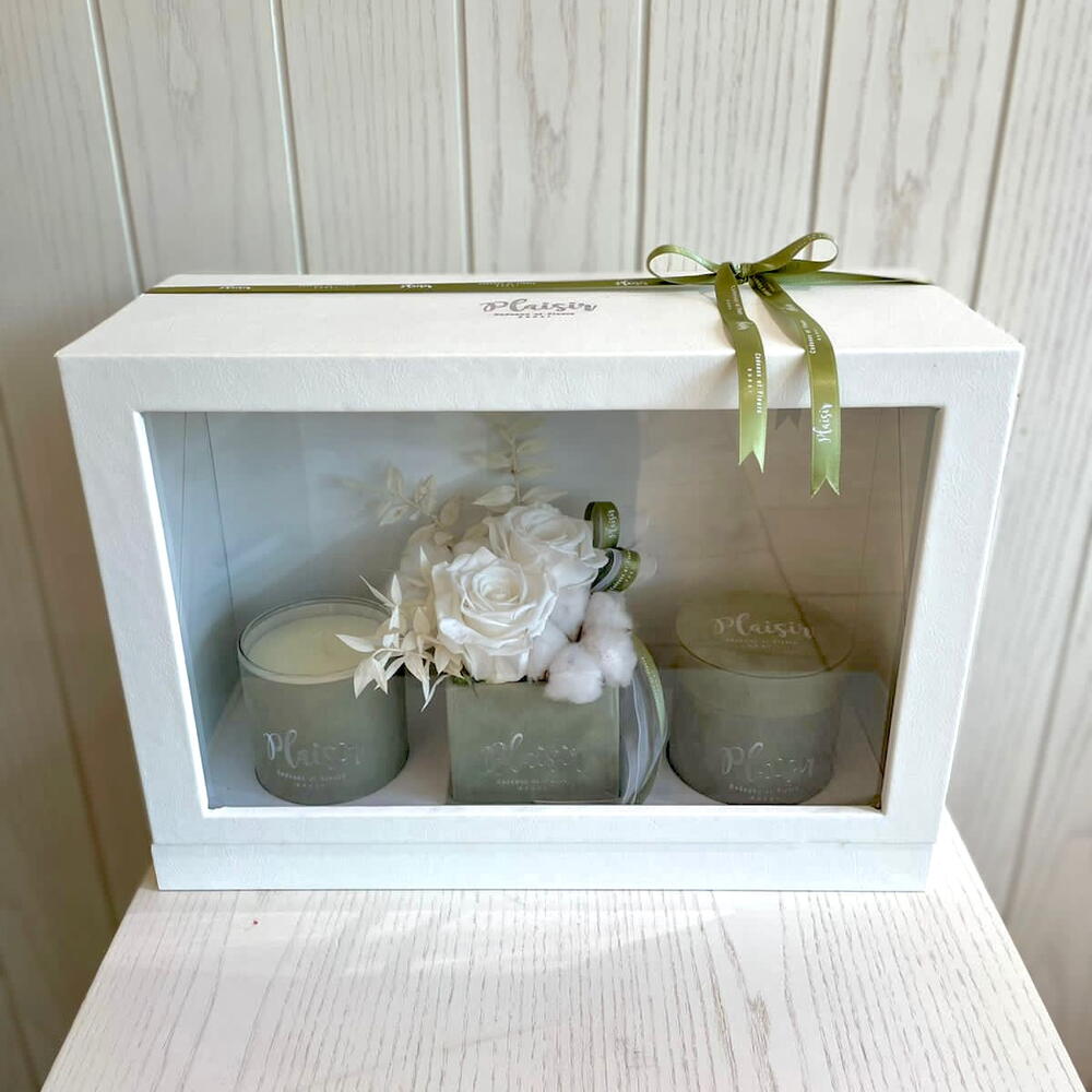 Plaisir’s Trio Gift Box takes the guesswork out of finding the perfect and well-considered gift. It includes a luxury candle, delicious chocolates and a (6) rose infinity rose, also known as Forever Rose or Preserved Rose arrangement that will last for more than one year. Aesthetically pleasing, each item is designed in matching velvet and elegantly presented in a luxurious gift box. (Size of the infinity arrangement is 12x12cm, size of the chocolate box is 8x8cm, size of the candle is 9.5x8cm)