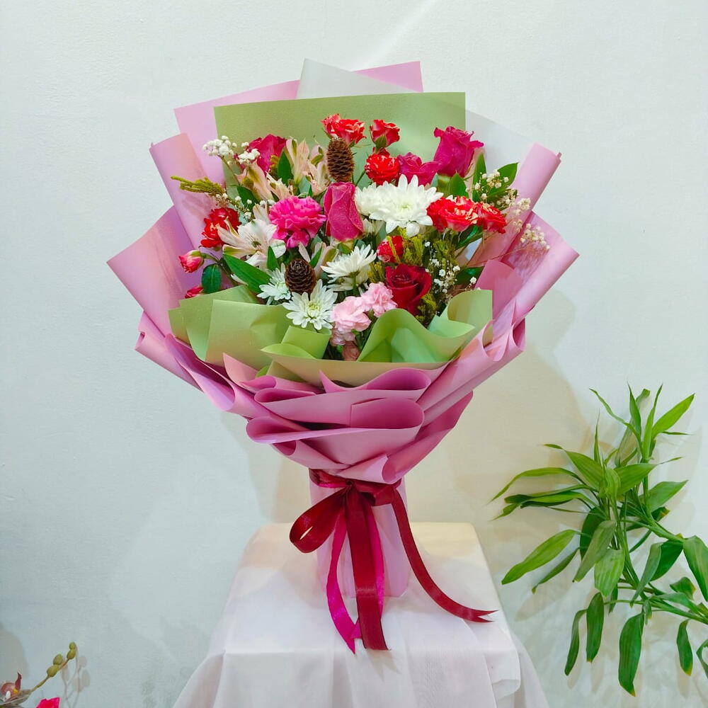 Red rose - 1 pcs Chrysanthemum - 4 pcs carnation - 3 pcs gypsophila white - 3 pcs fuschia rose - 3 pcs leaves and others. - 3 pcs firework baby rose - 7 pcs