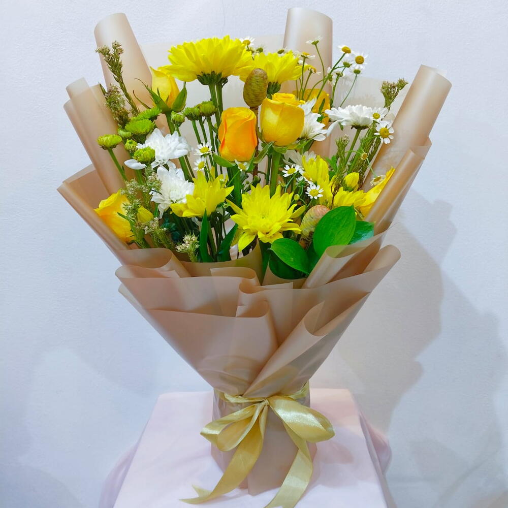Discover the vibrant delight of our florists special arrangement. This unique bouquet features the sunshine brilliance of 4 yellow roses subtly balanced with 7 bountiful chrysanthemums in matching yellow tones, nestled amidst an uplifting sea of 10 cheerful daisies. Touches of elegance are added with 1 piece of leafy Ruscus and 5 pieces of artfully arranged dried leaves, making this composition perfect for every celebration, or simply as a vibrant addition to your home decor.