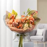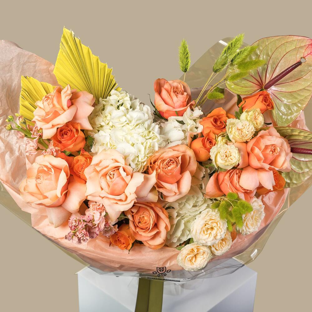 Hydrangea - 2 pcs Anthurium - 2 pcs matthiola - 2 pcs wraping - 1 pcs dried palm spear - 2 pcs blad pistacia - 3 pcs dry lagurus bundle light purple - 20 pcs rose spray mineola - 2 pcs rose orange wave 50 key - 6 pcs rose kahala 50 ecu - 8 pcs