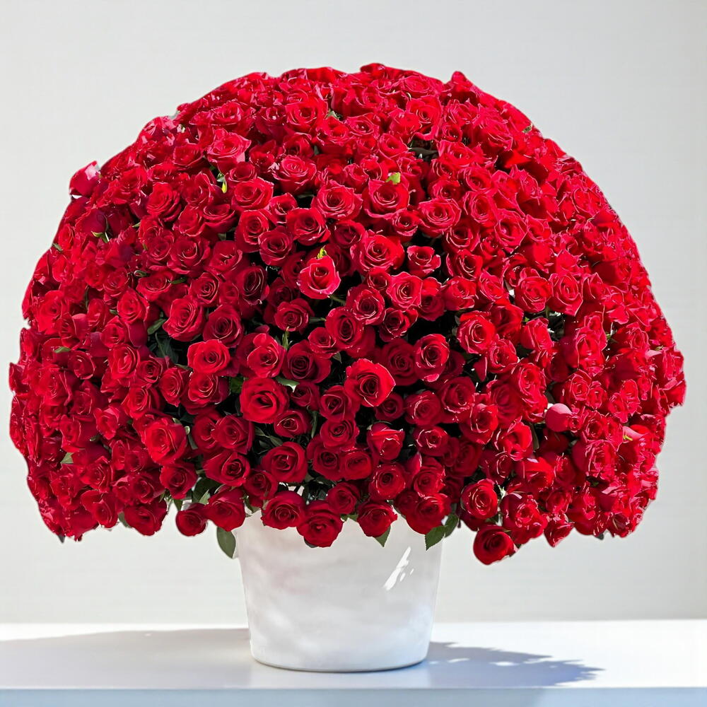 Indulge in the breathtaking beauty of our exquisite collection, featuring an impressive set-arrangement of 501 resplendent red roses, meticulously handpicked and placed with precision in one luxurious ceramic pot. This awe-inspiring creation, lovingly encased in a box, injects instant charm and elegance, making it the ultimate gift for transforming ordinary moments into extraordinary memories. Complete any occasion with the captivating spectacle of this floral marvel!