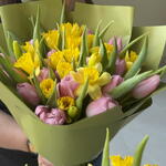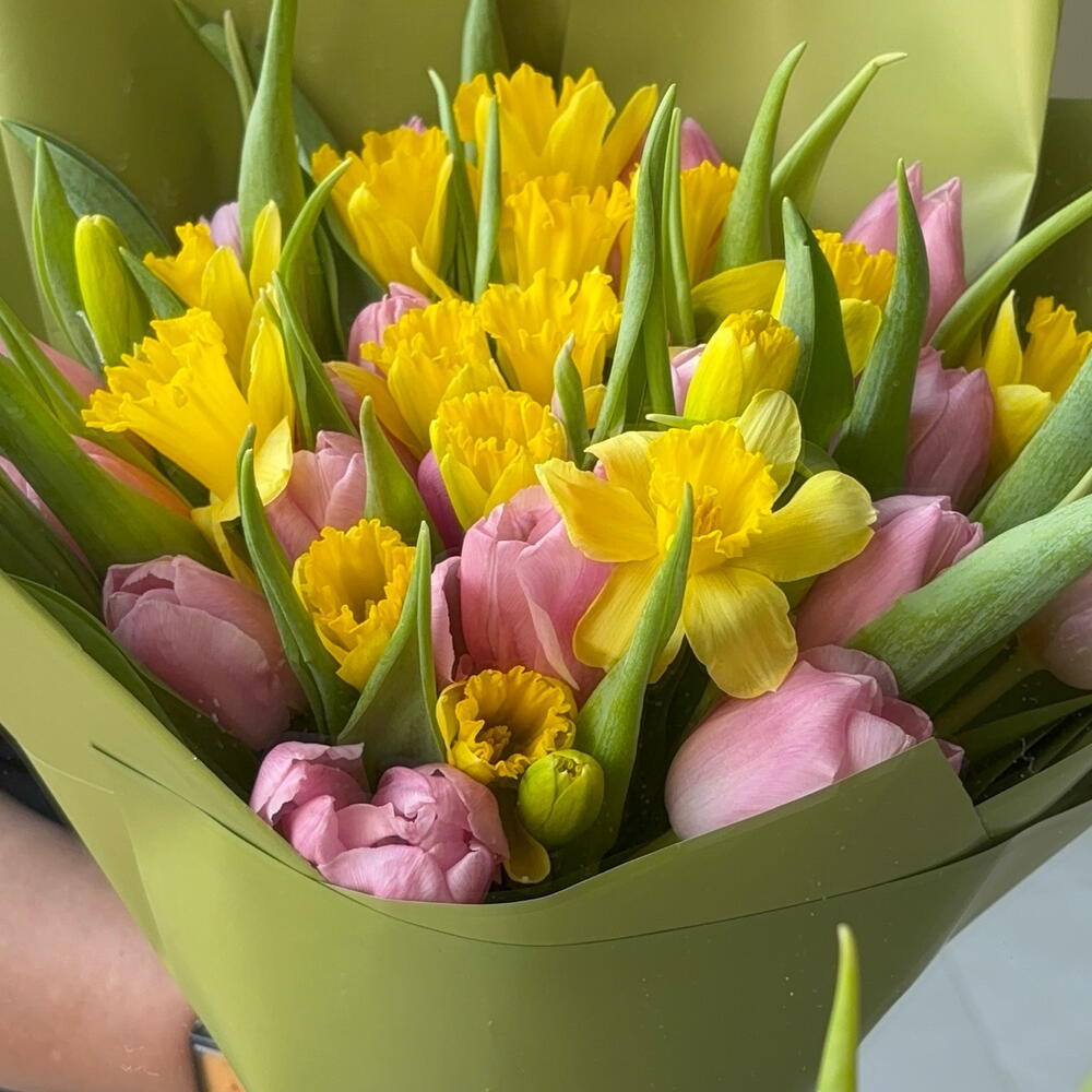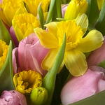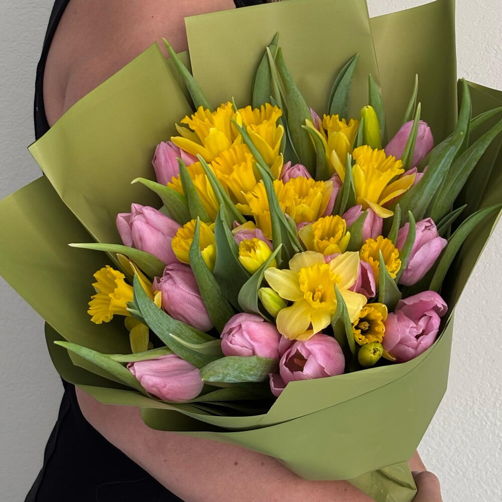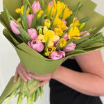 Gentle tulips and elegant narcissus always good choice, pink colour of tulips make bouquet lovely, yellow narcissus giving for bouquet freshness and happy mood.