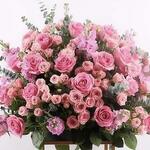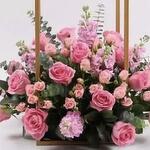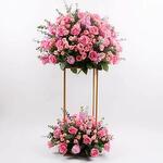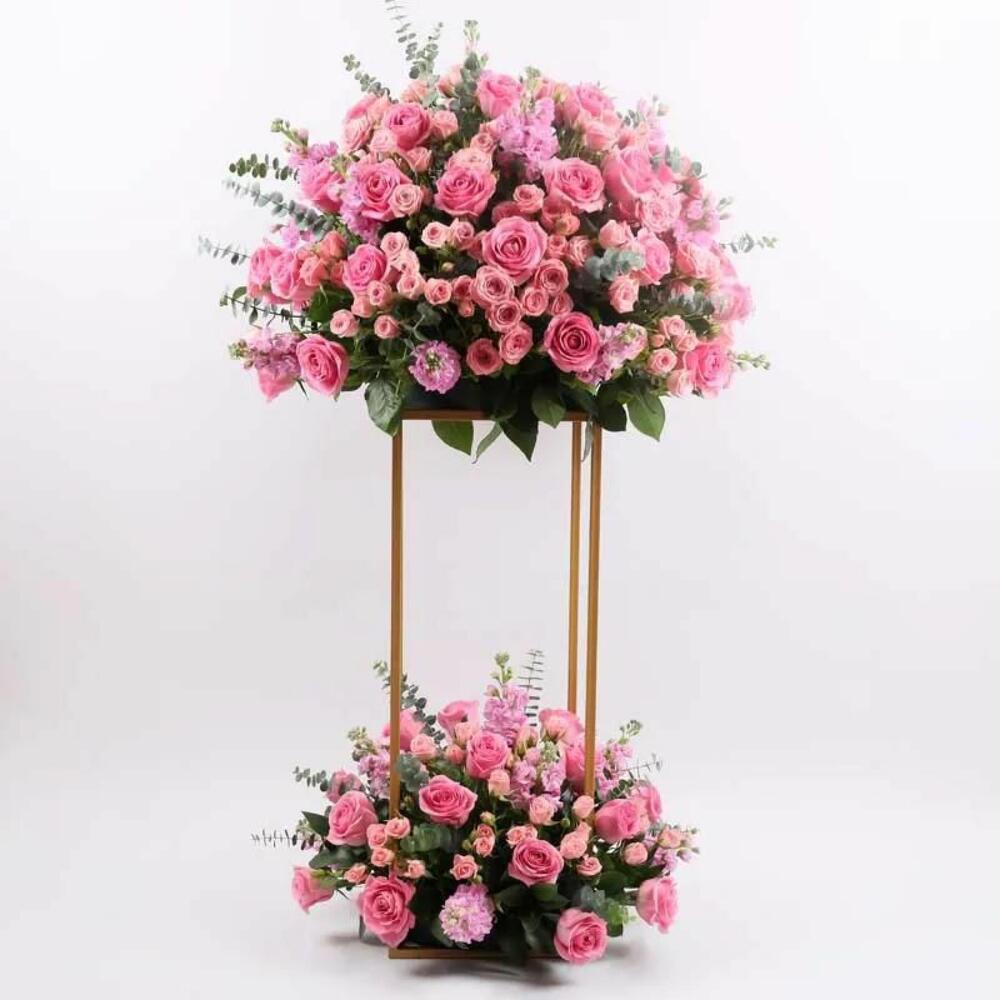 This two-tier floral stand overflows with lush pink roses and soft greenery, bringing elegance, charm, and a fresh floral glow to any celebration. Perfect for grand openings, weddings, or milestone moments