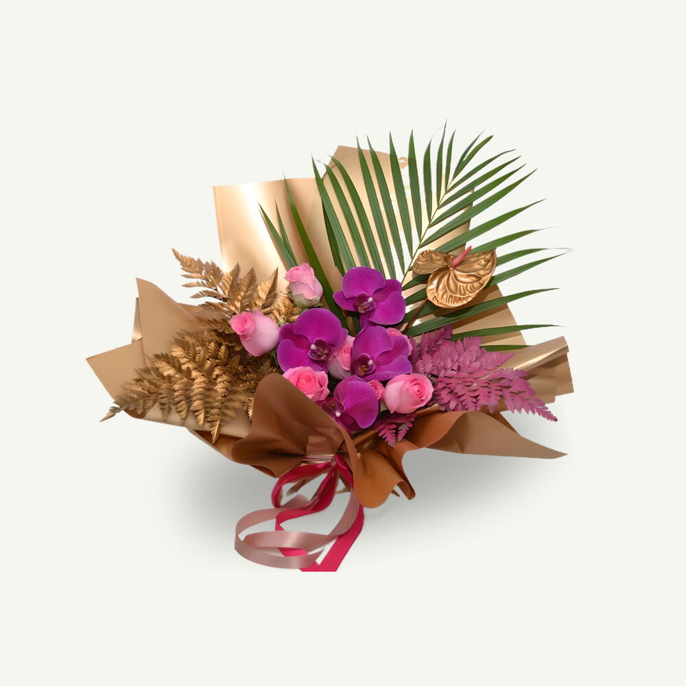 Hand-crafted bouquet with a mixture of 10 pink roses, 1 golden anthurium, 2 gold and 1 pink painted fern leaves, 4 purple orchids, and a palm leaf, gently crafted in luxurious gold wrapping for a vibrant and elegant presentation.