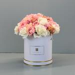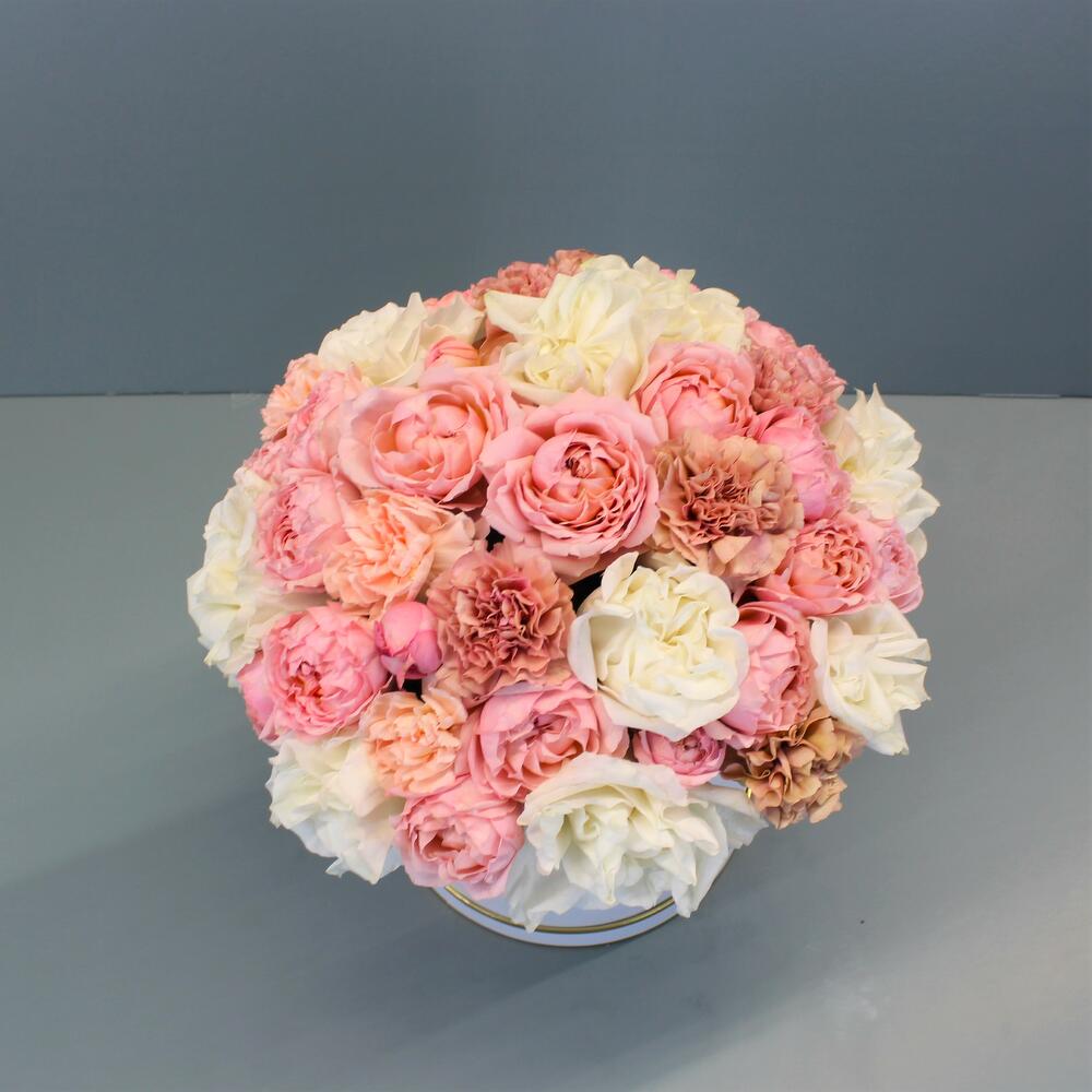 A beautiful bouquet of fresh garden roses, carnations, and garden spray roses, arranged in a classic white box. This bouquet is perfect for any occasion, from birthdays to anniversaries to simply saying "I love you." The roses are a white, the carnations are a soft Brown, and the garden spray roses are a light Pink. The flowers are arranged in a cascading style, and the white box gives the bouquet a classic and elegant look.