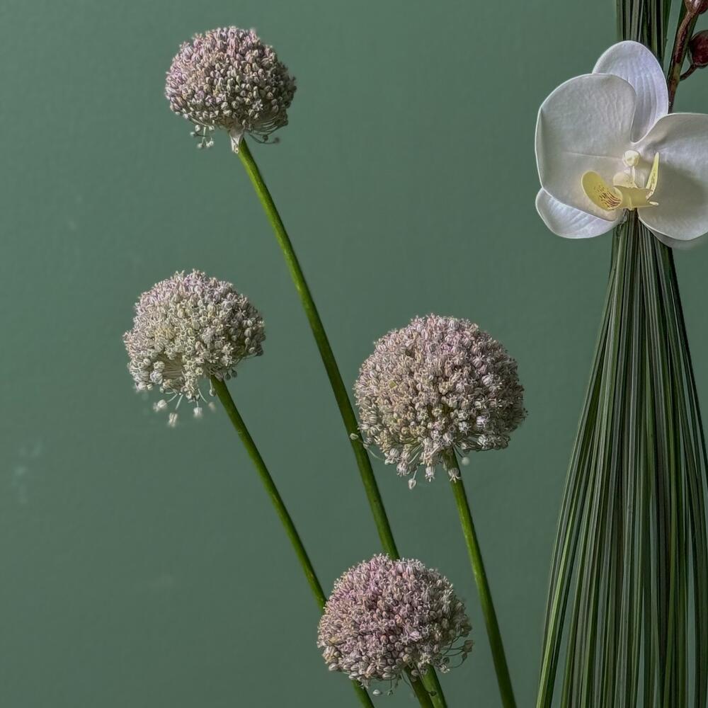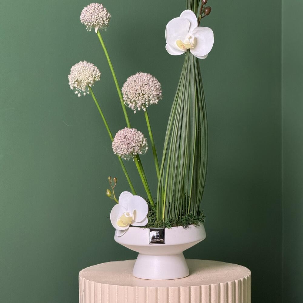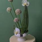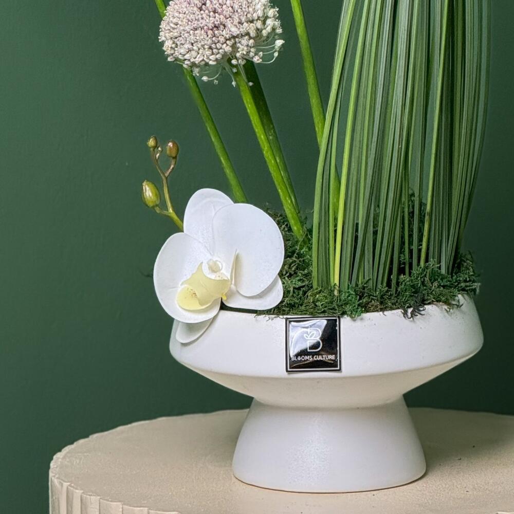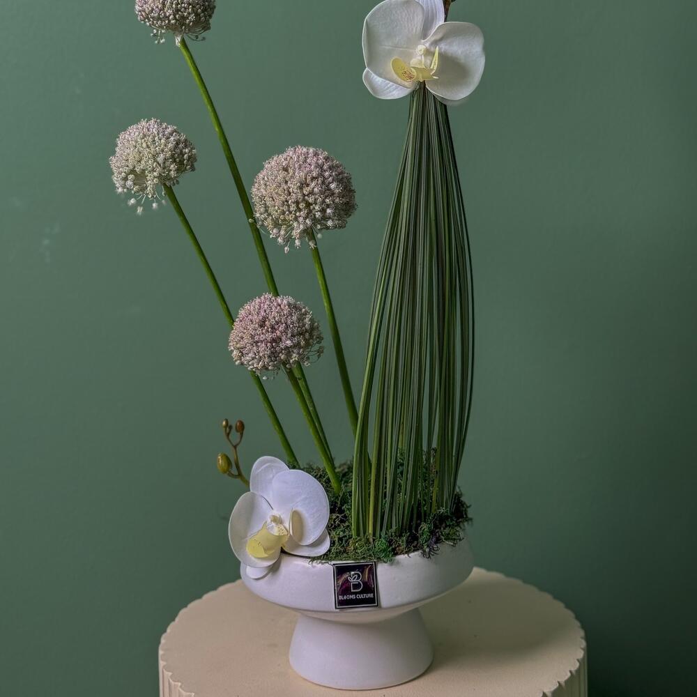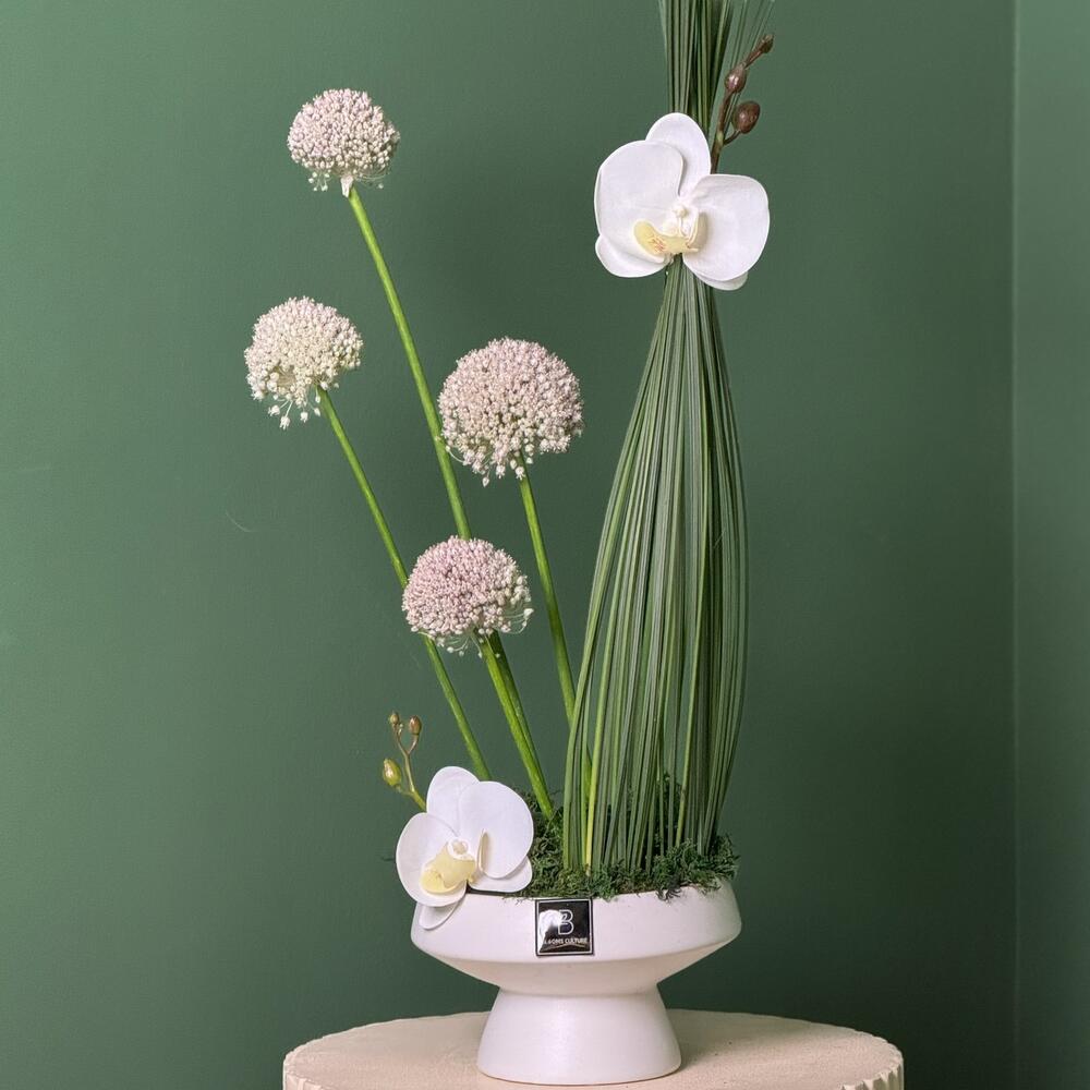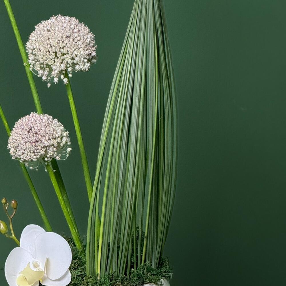 grass - 1 pcs ceramic vase - 1 pcs phalaenopsis orchid - 2 pcs steel grass - 25 pcs allium white - 4 pcs green wire - 1 pcs